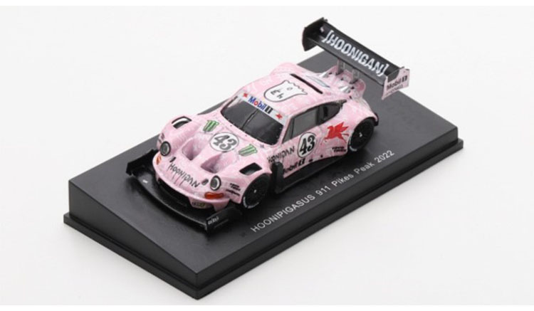 HOONIPIGASUS Porsche 911 No.43 as driven by Ken Block at the 2022 Pikes Peak International Hill Climb. Faithfully reproduced using official reference materials, this collectible captures the car’s aggressive aero, race livery, and distinctive HOONIGAN styling. A standout piece for Ken Block, Porsche, and modern motorsport collectors.