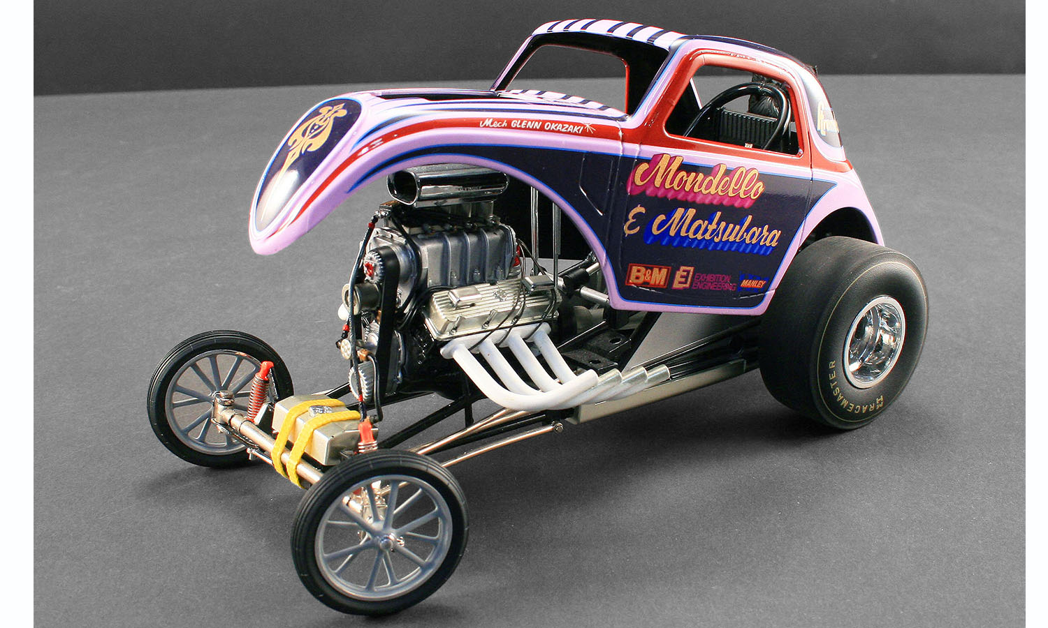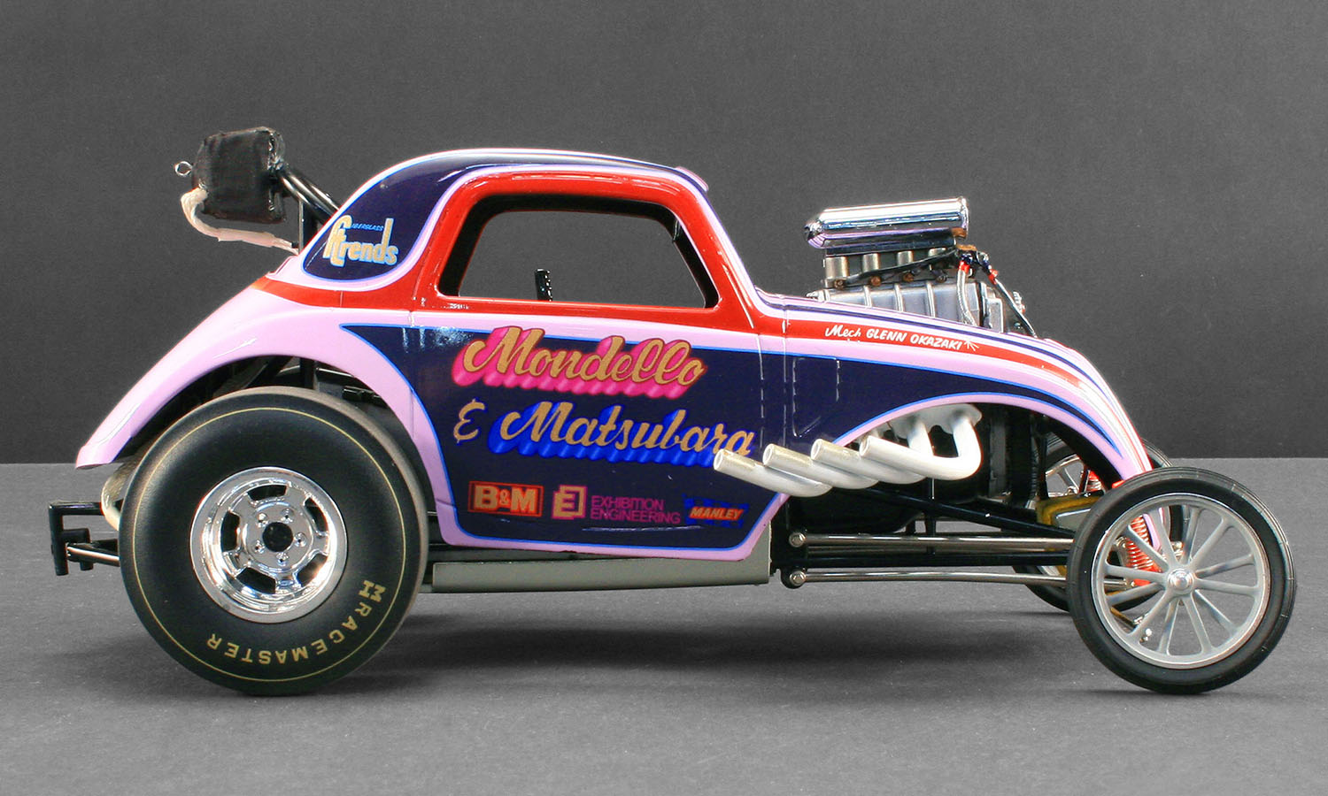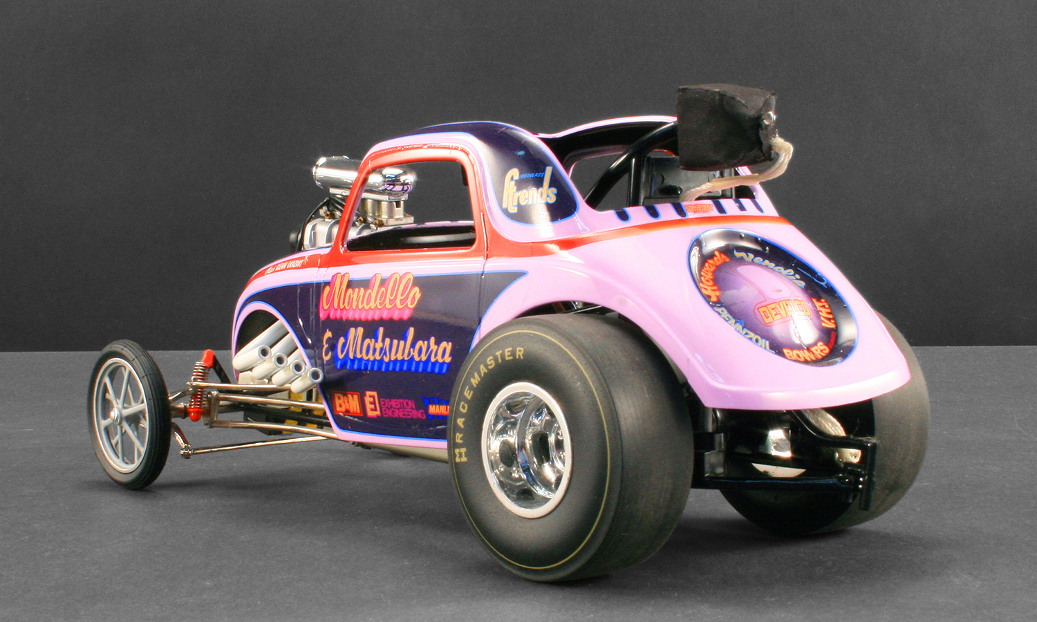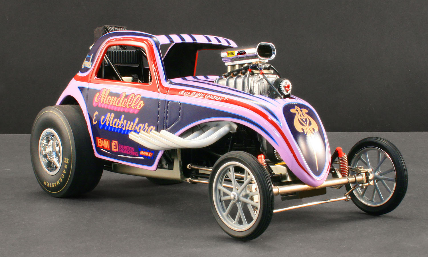 Back in the mid 1960's the two biggest names known around the drag racing community were Mondello & Matsubara. After the two teamed up in 1965 the drag world was never the same. They set numerous records and built one heck of a reputation to boot! They ran two very succesful fiats with smaller powerplants and in early 1969, Matsubara ordered another car; this time from a company named Exhibition Engineering. This Topolino helped further to immortalise the efforts of M&M. With it's wild paint job and blown 472 Chevy poerplant, it was a force to be reckoned with on the track. M&M set the national record for AA Fuel Altereds with a 7.24 ET and 213 mph pass at the U.S. Nationals in Indianapolis in 1969, and won runner-up in Competition Eliminator. To put that amazing performance into perspective, the low ET for Funny Cars at that event was 7.22! M&M certainly carved thier names in the history books with runs like that. Now you have an oppurtunity to own an amazing piece of drag racing history with our all new release of the beautiful M&M altered dragster. This will surely be a sellout quickly so get your pre orders in today!