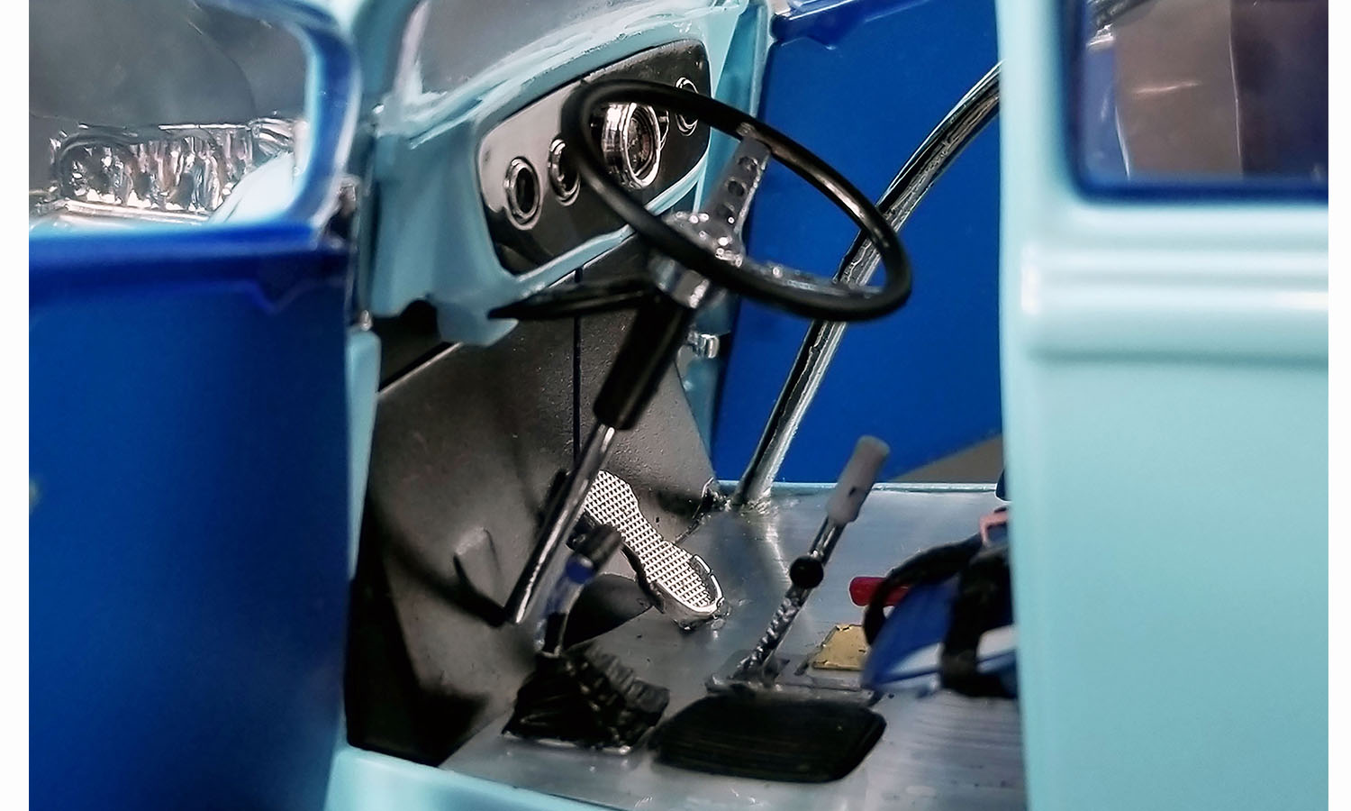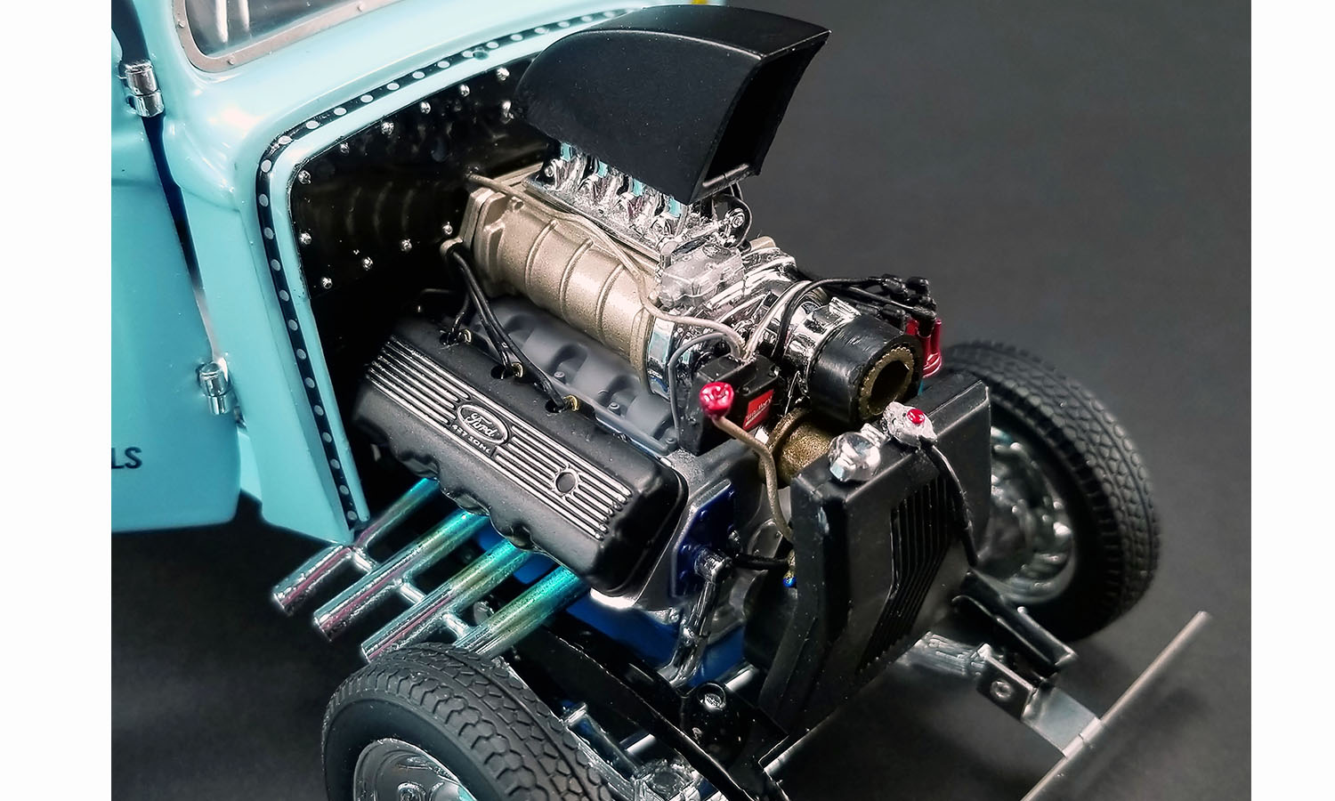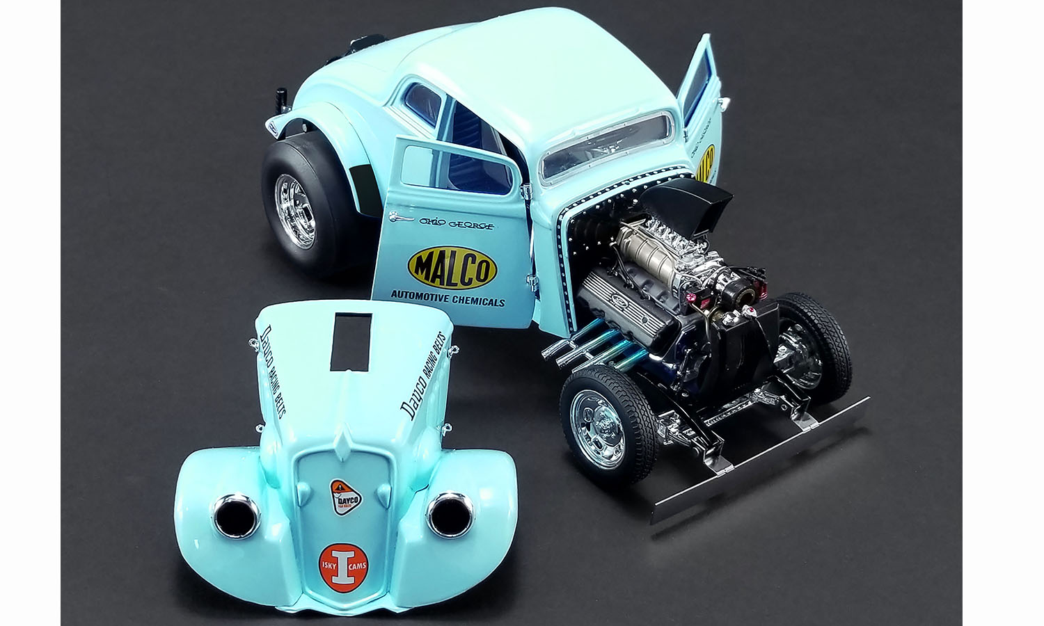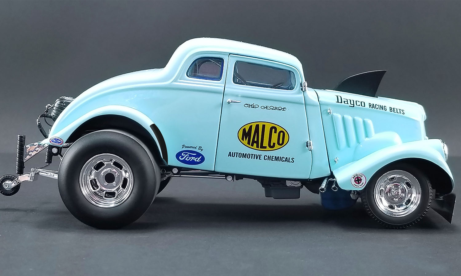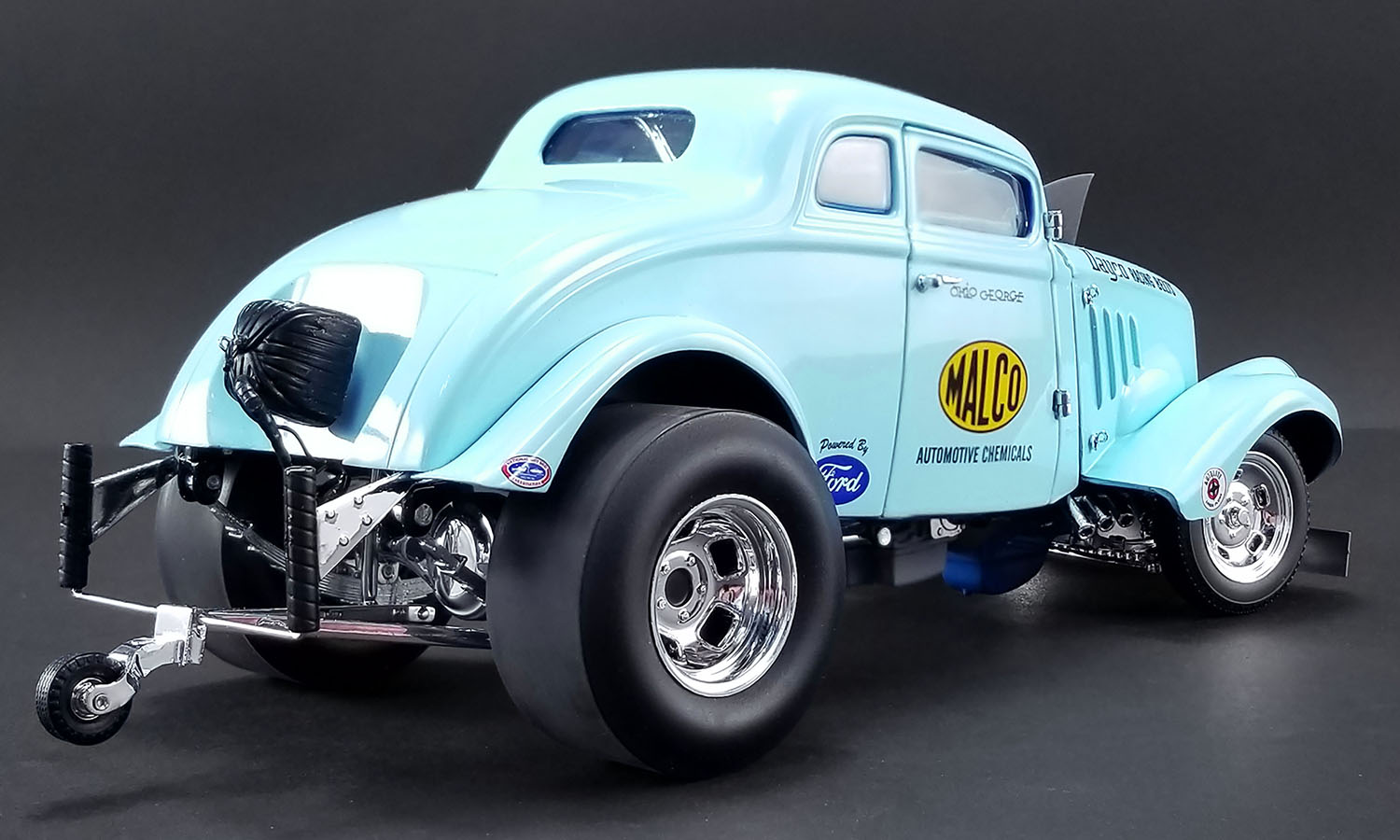 ACME had an oppurtunity to talk and work with Ohio about making his rare ‘33 gasser with the rare air plow version and we decided to do it! Here are George’s words about why it was needed... “Ford had me bring the Willys to their wind tunnel. At 125 mph it had over 600 pounds of lift at the rear tires. In the wind tunnel, cars sit on scales. Well the back slicks were just about to levitate at the highest wind tunnel velocity. I took this data to an aerodynamicist friend from Wright-Patterson AFB, and we devised a snow plow front air foil that made the car easier to drive at the top end during match races. But the NHRA made me remove it for the big sanctioned events.” ACME is proud to offer this unique piece of drag racing history that few even know about! Decorated in that beautiful blue color and powered by that tremendous 427 SOHC engine this one really stands out in the crowd!