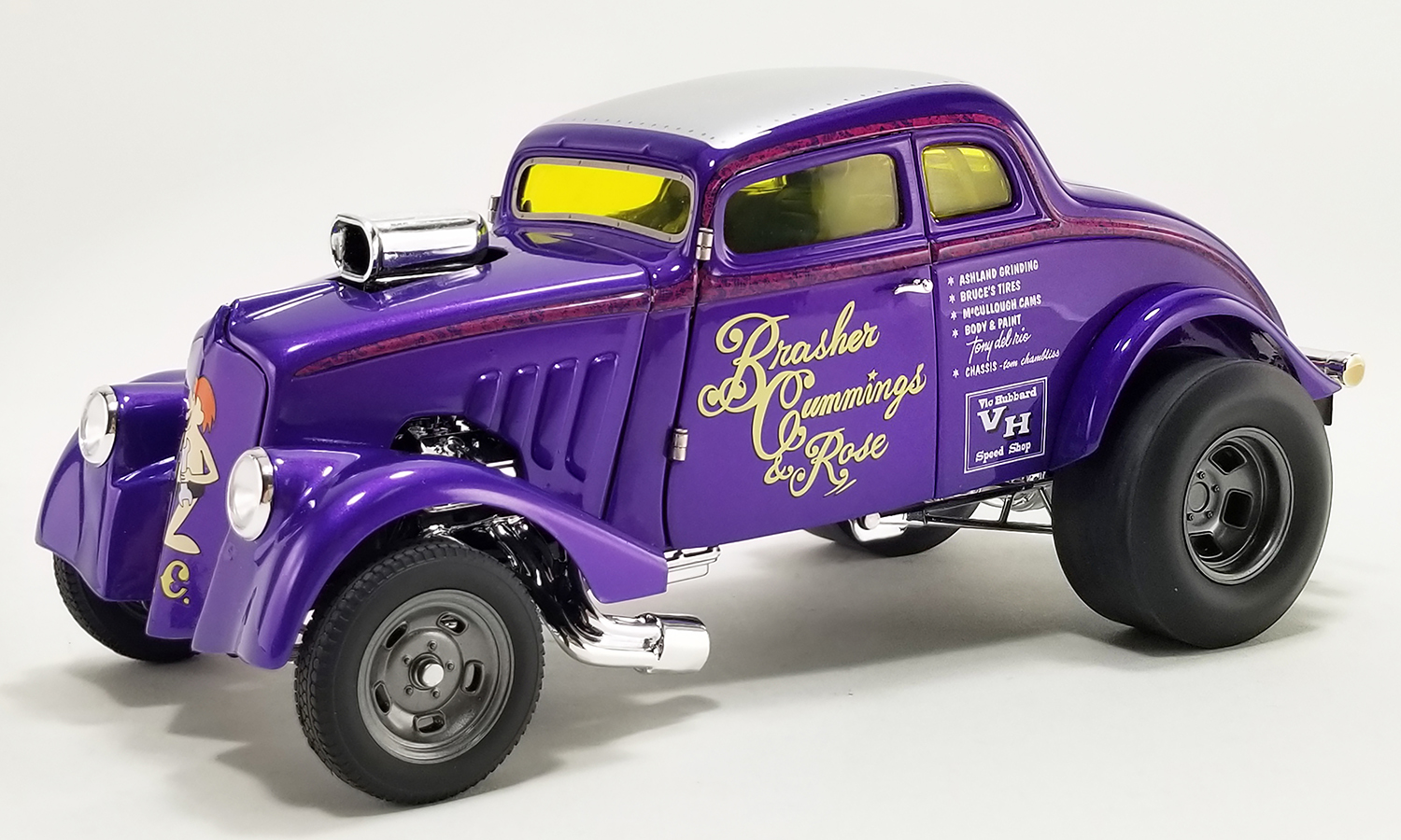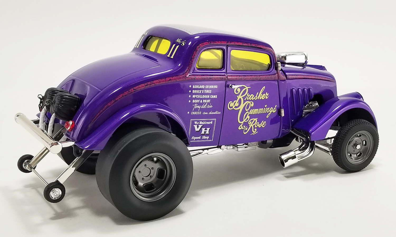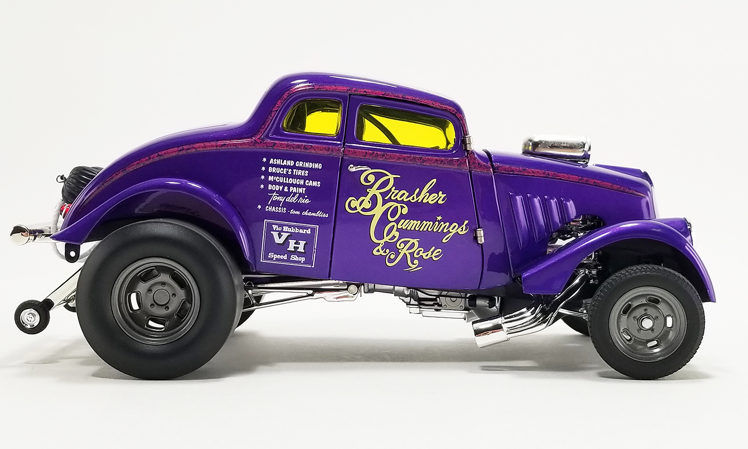If you were into Drag Racing through the 60's, 70's or 80's in Northern California you may have seen the Brasher & Cummings 1933 Willys run in these California Gasser Wars. And if you did you may have seen BC turn a 8.56 ET at 162.30 MPH or maybe you saw her best run at 168 plus MPH. Constant modifications kept BC extremely competitive in A/GS and at some point, Terry Rose joined the team. With him came a blown and injected 392 Chrysler Hemi. Rose's name was added to the door and, according to Cummings, BC ran its best time ever.