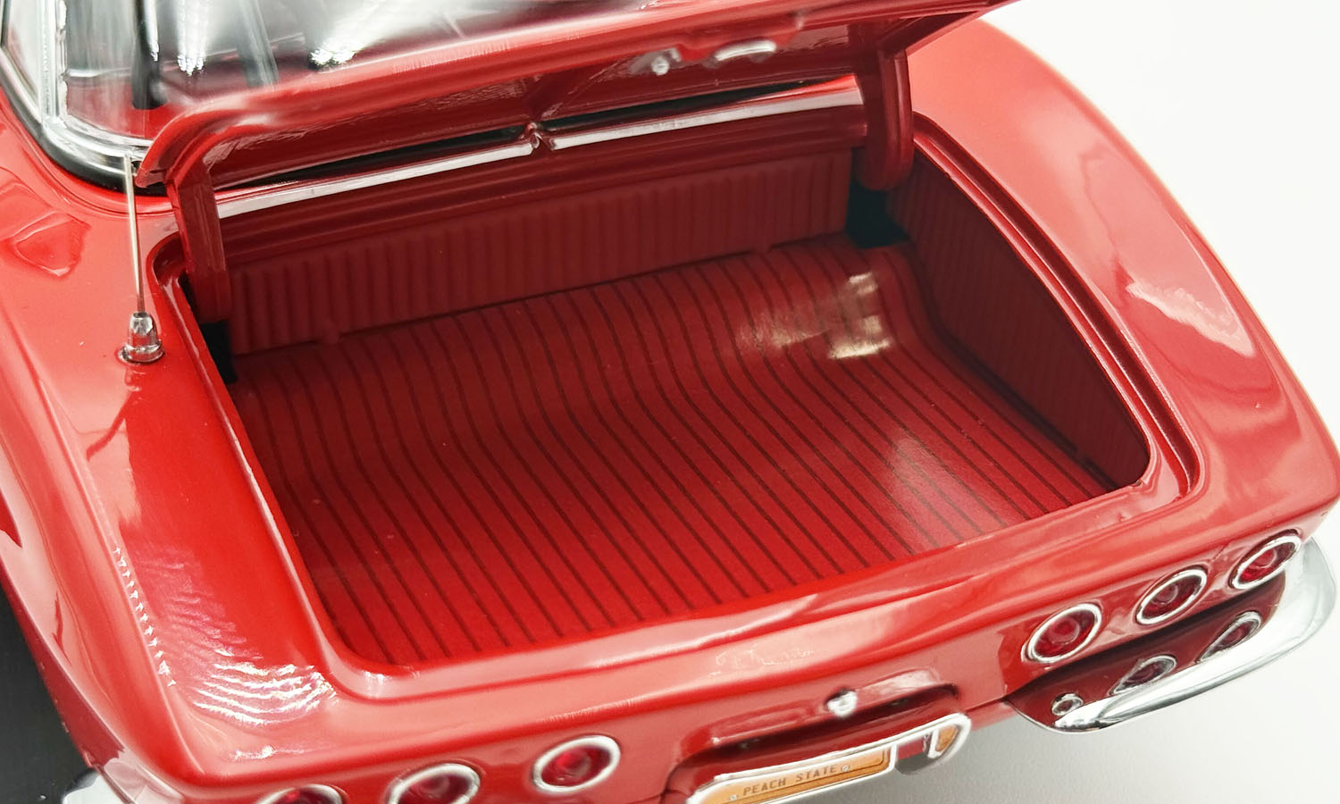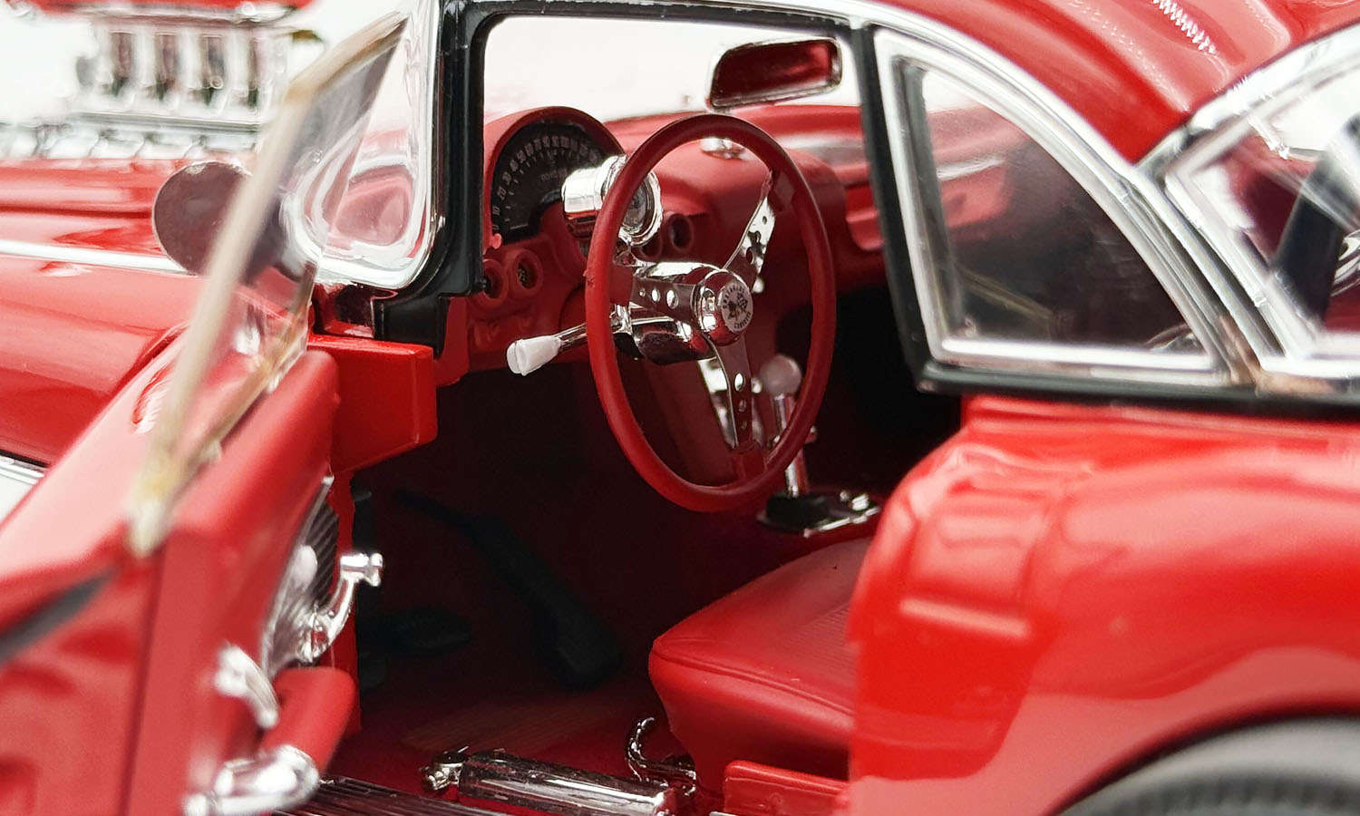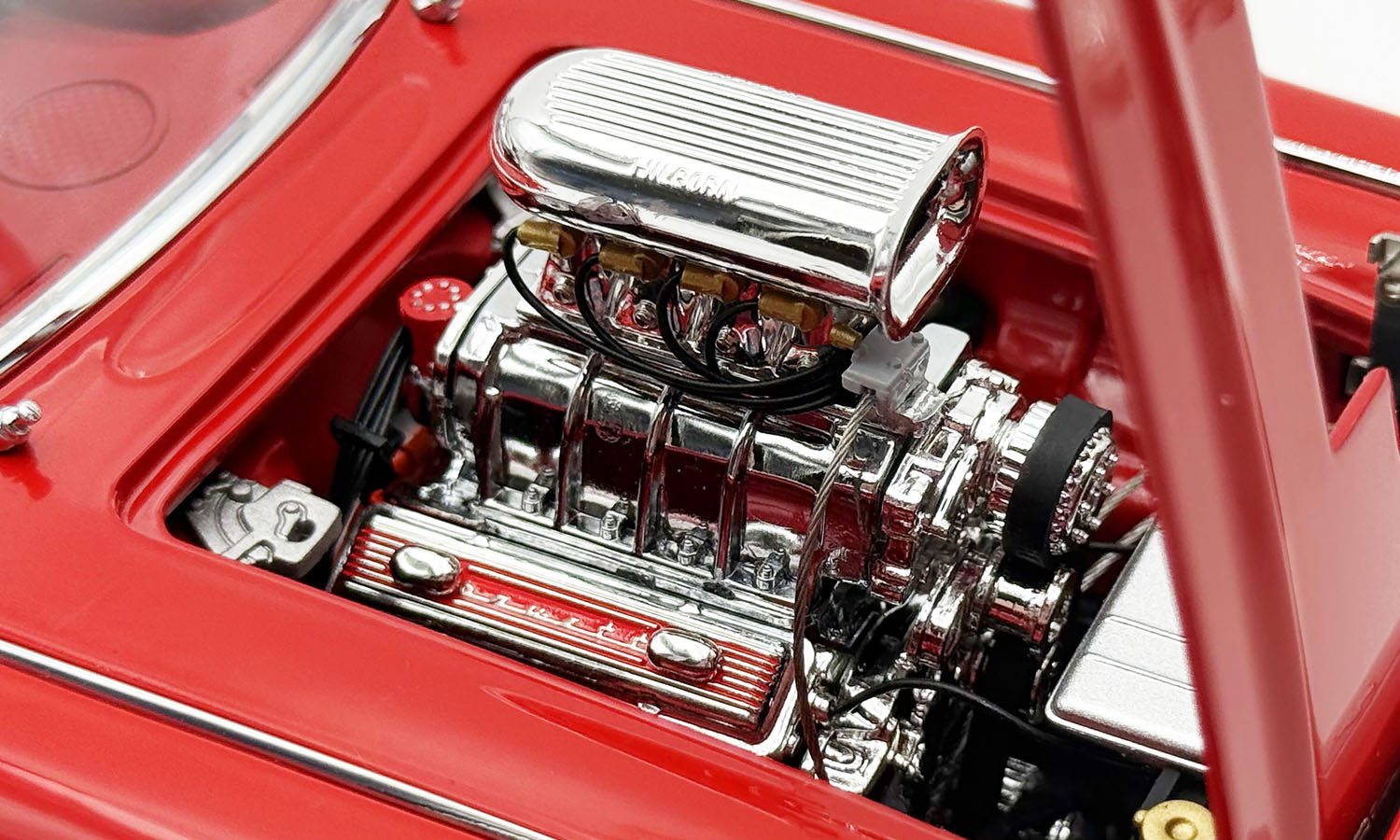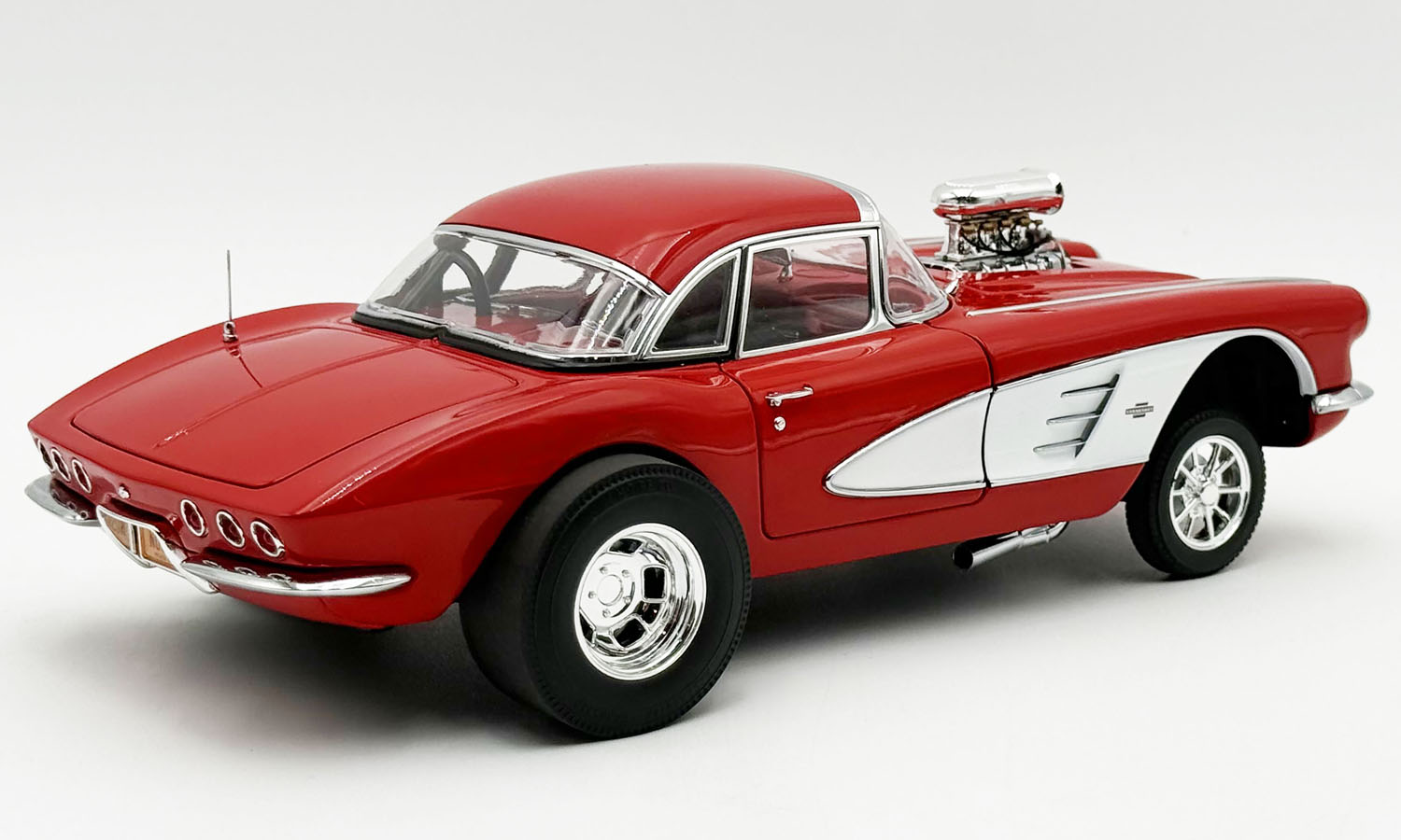 This wicked 1961 Chevrolet Corvette Gasser is decked out in a two-tone red and white paint scheme set on a set of drag style wheels and tires. Armed with a blown 238 Fuelie engine with custom headers gives this beauty all the power to take on any competitor. Open the doors to reveal a beautiful red interior with a detailed dashboard, seats and seat belts. Opening trunk and hood with a detailed chassis and poseable steering and so much more!