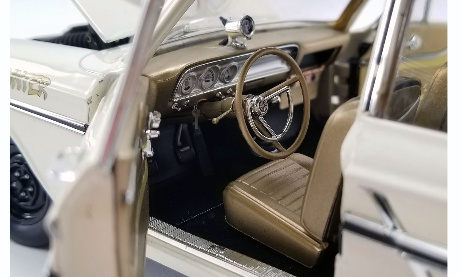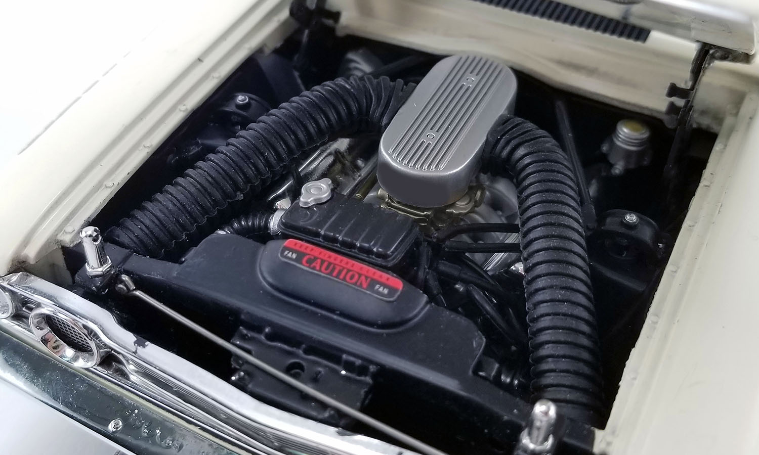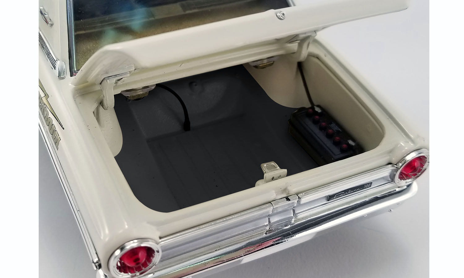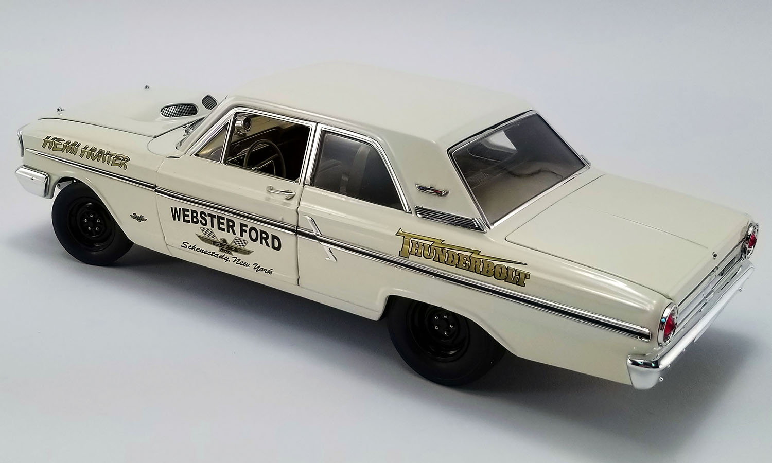 Today the “Hemi Hunter” Thunderbolt is in spectacular condition after being restored by Performance Restorations. It has never been tubbed or fitted with a roll bar, and retains all its original sheet metal beneath the as-original Wimbledon White paint. Most importantly, it also still packs that “unbeatable” Ram Air-fed 427 Galaxie engine under its factory tear-drop hood.
