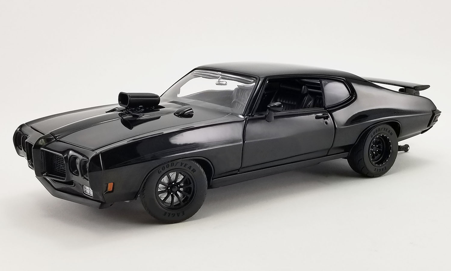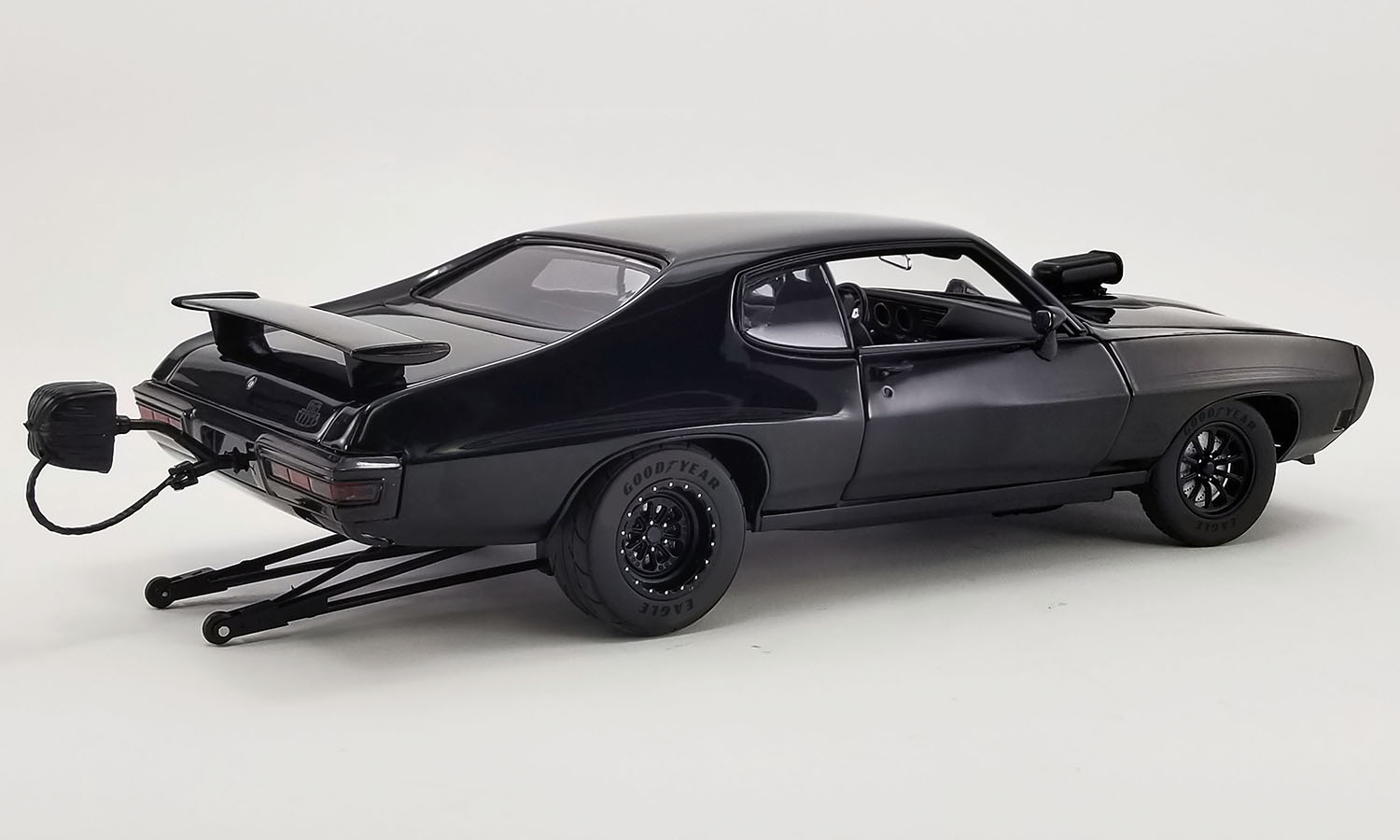 All Rise! ACME Trading is thrilled to present the honorable and wicked 1:18 1970 Pontiac GTO Judge Drag Outlaws - JUSTIFIED This latest Drag Outlaws release decked out in triple black drops the hammer on the competition! Sporting new drag wheels and tires with a blown 455 engine supplying all the power to blaze down the strip. Complete with wheelie bars, drag parachute, nitrous bottles mounted in the trunk, and so much more!