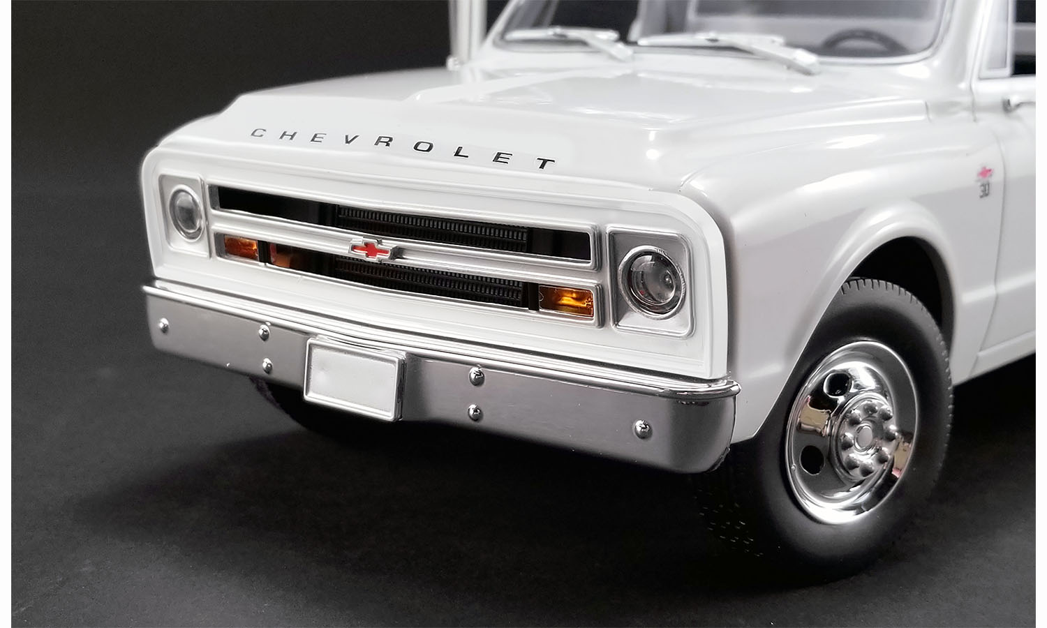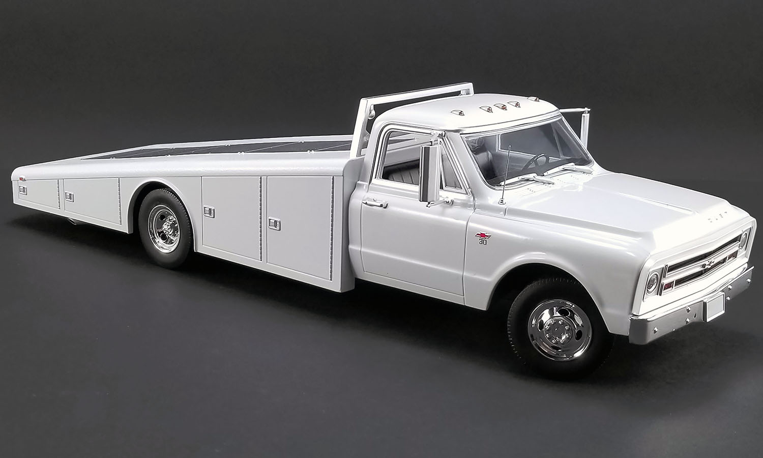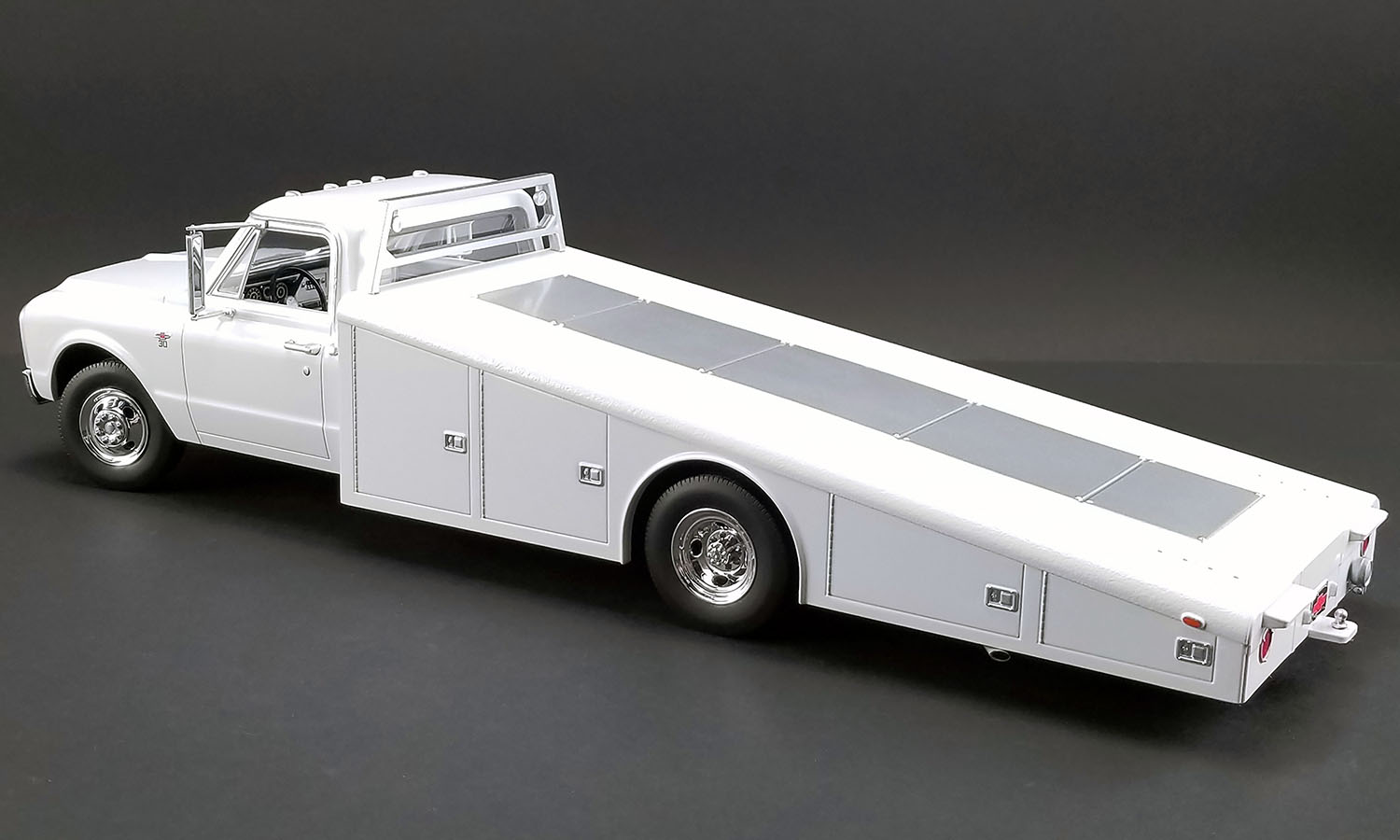 ACME is proud to announce this all new 1:18 Chevy C30 ramp truck tooling! These trucks were a critical piece of any race team carrying not only the car but all the tools, equipment and supplies critical to a race car and crew. This model features poseable steering, fully detailed interior with manual floor shift and bench seat. You can choose to add the removable rear rack or run without it. Pull out the ramps from the bed and load your favorite race car and head to the track! Don’t forget you can adjust the wheel chocks in the rear for different length cars too!