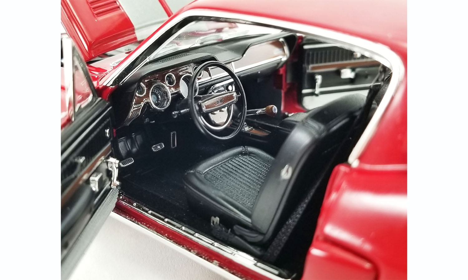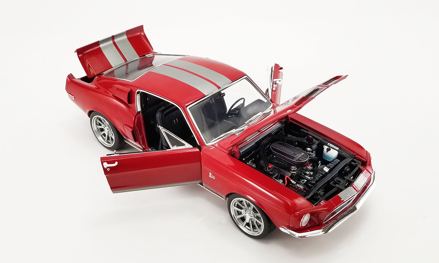 The 1968 Shelby GT500 KR Restomod puts a "new school" twist on this classic. Adding more firepower to the custom 428 Cobra Jet engine set up is a NOS bottle set up in the the trunk. Finished in a gorgeous Candy Apple red paint with metallic stripes with Streetfighter wheels and tires.