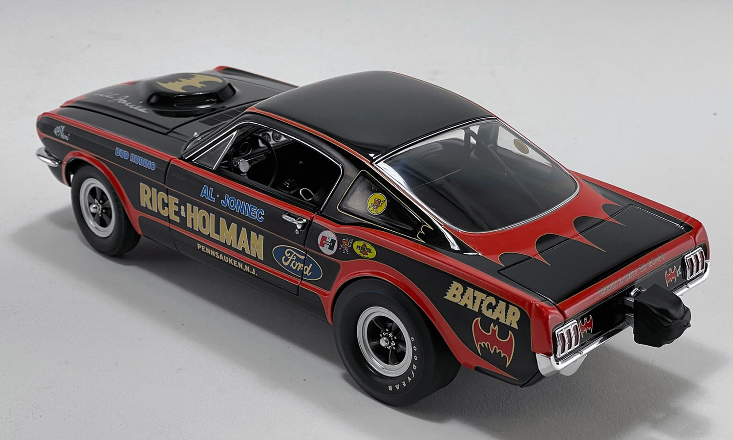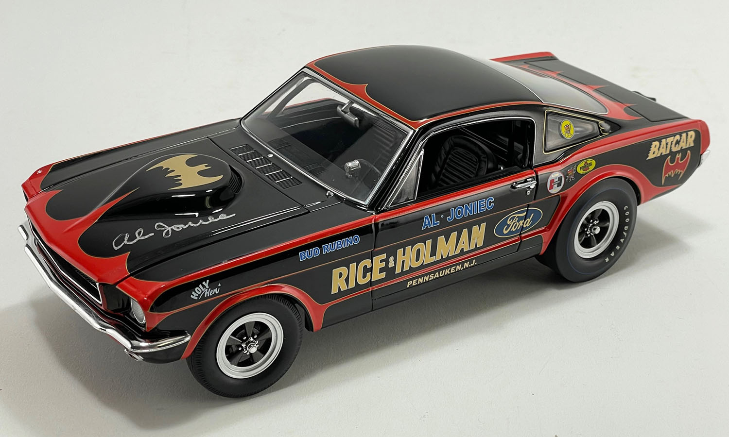 As the drag wars heated up among the factory hot rods, the Factory Experimental category of racing grew wildly in its popularity. The BATCAR , sponsored by the famous Rice & Homan Ford dealer, was one of 10 Mustangs commissioned by Ford to be made into purpose-built drag cars by the Holman & Moody team. The pilot of the BATCAR was one of the most accomplished drag racers of the day, Al Joniec. Al and the 427 cammer powered Mustang would set numerous records together. One of their quarter mile passes was 8.70 seconds at 170mph! Another cool fact about the BATCAR is that it was one of the first A/FX cars to move the body back on the chassis to maximize weight transfer for racing, leading to the term "funny car".