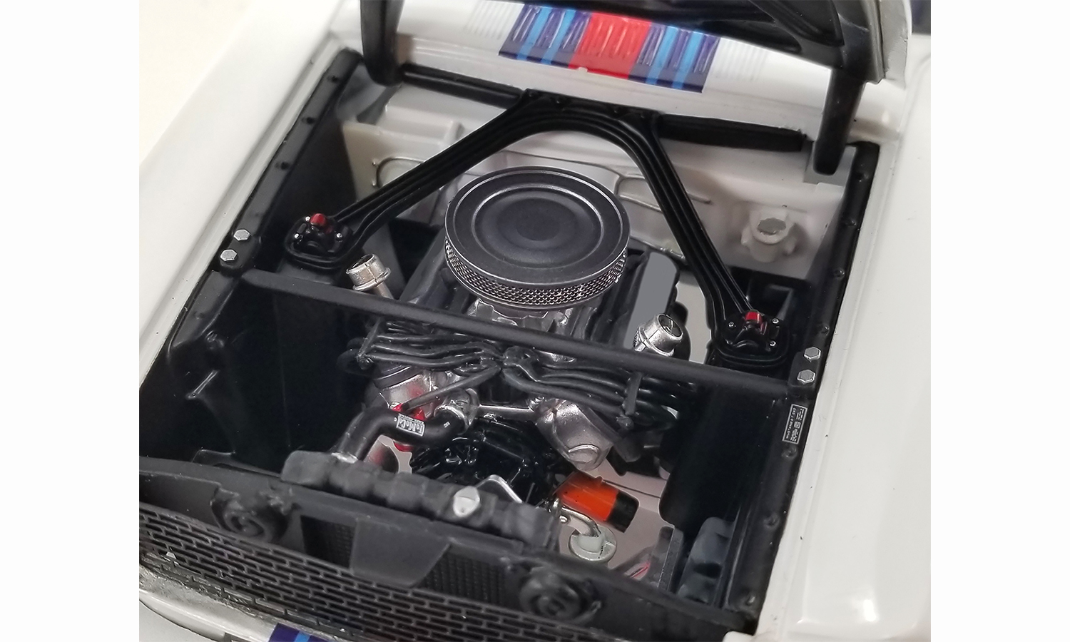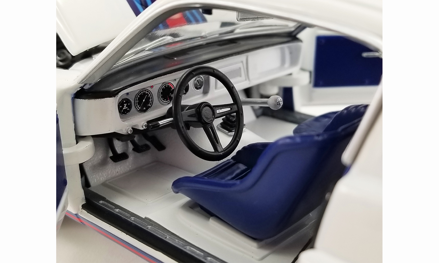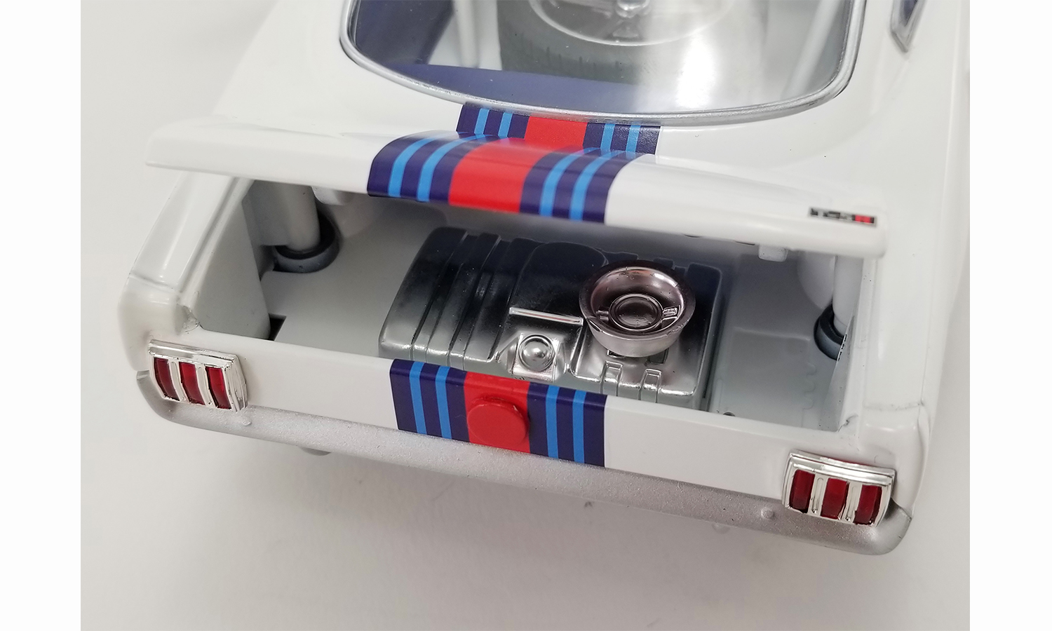 This is one amazing 1965 GT350R! It has been finished in gloss white with a decoration package honoring the famous red and blue Martini Racing stripe package that we saw on so many famous Le Mans racers from the past. Additional features include a full race interior with white roll cage and custom blue race bucket seats, five spoke street fighter wheels and tires and side exit exhaust!