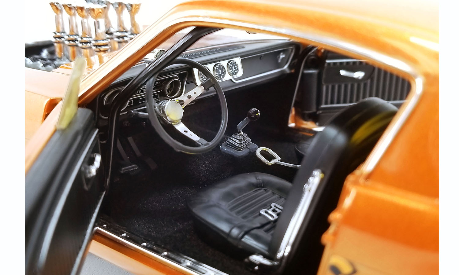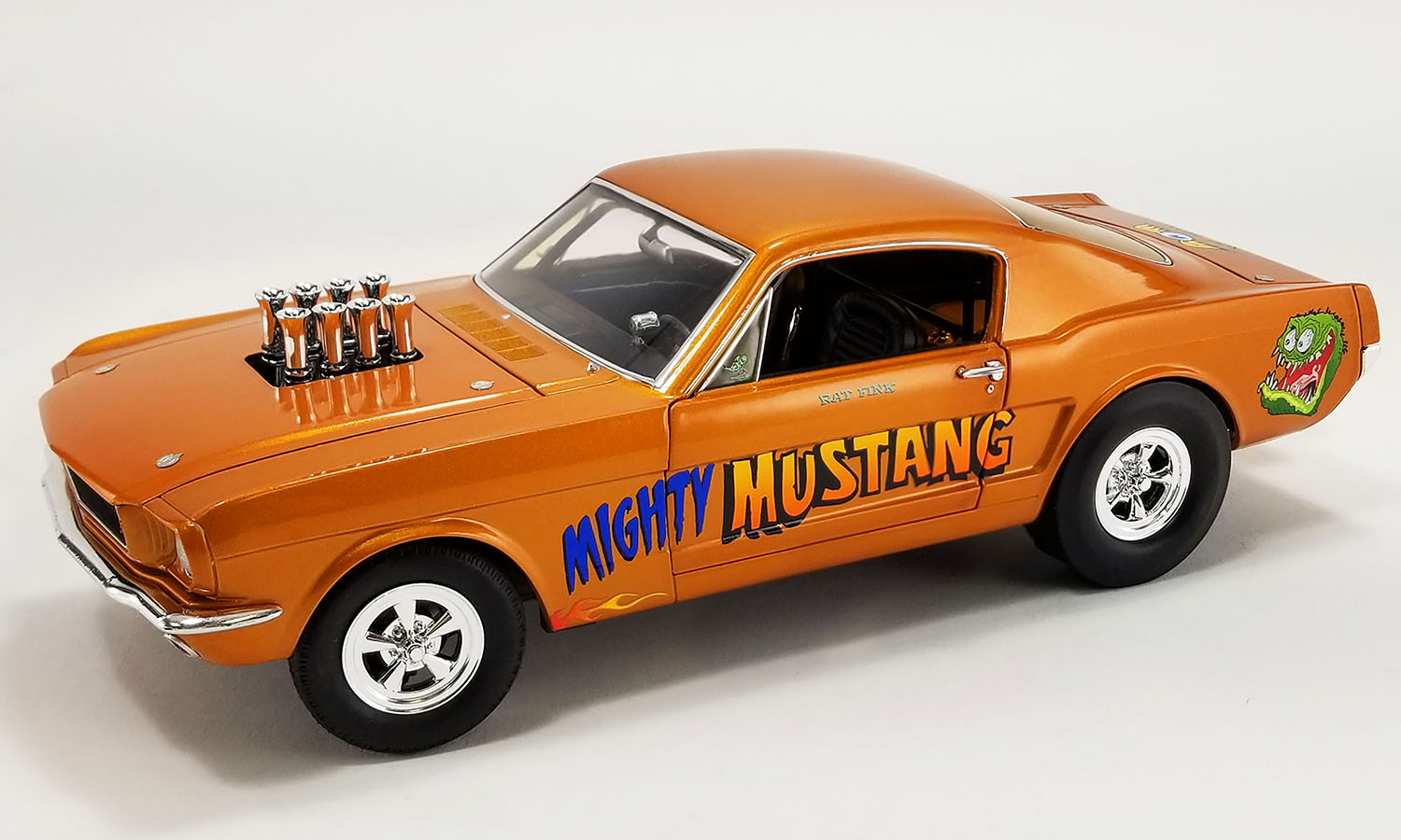 ACME has combined the 1965 Ford Mustang A/FX with the iconic artwork of Ed Roth's Rat Fink Mighty Mustang to bring you this next release in our Rat Fink lineup! This wicked Mustang A/FX is powered by a injected 427 cammer engine sporting velocity stacks. Along with the creature on the back quarter panels and Might Mustang down the sides, you'll note the "flying eye' on the trunk lid! The model also features a removeable roof, parachute pack, and Ed Roth Studio decal on the rear.