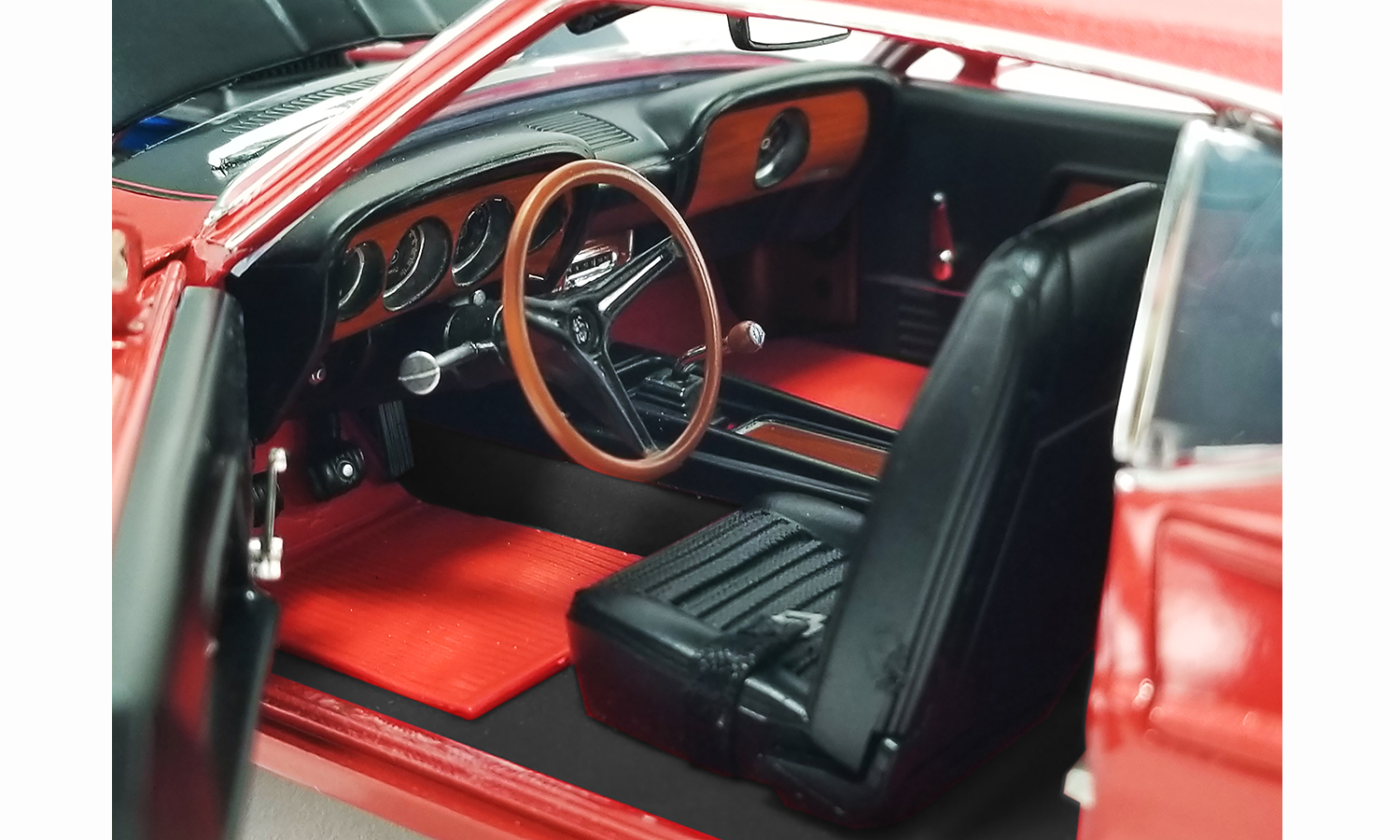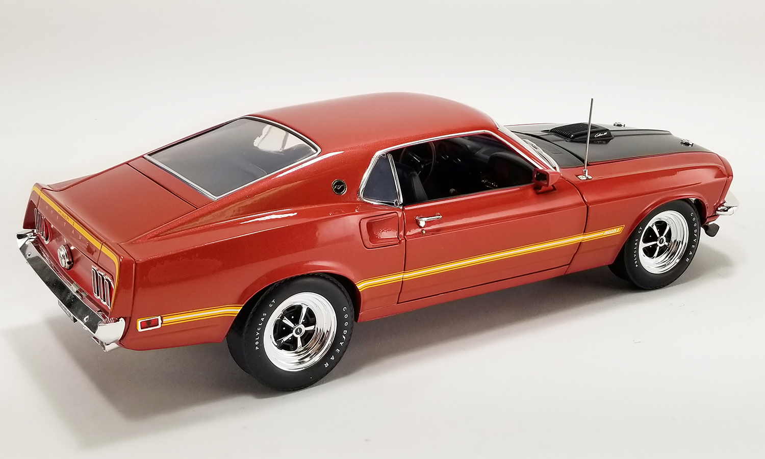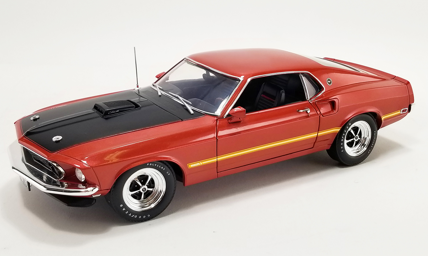 Limited to 428 Pieces - This Mach 1 is clearly a cool classic. The Indian Fire paint looks gorgeous in the sun and the Magnum 500 wheels and the black hood give it a race-inspired look. As for what's under the hood, this Mustang flexes one of the most powerful engines Ford offered in the late 1960s. The 428 Super Cobra Jet joined the Cobra Jet in 1969 and was rated at 335 horsepower and 440 pound-feet of torque.