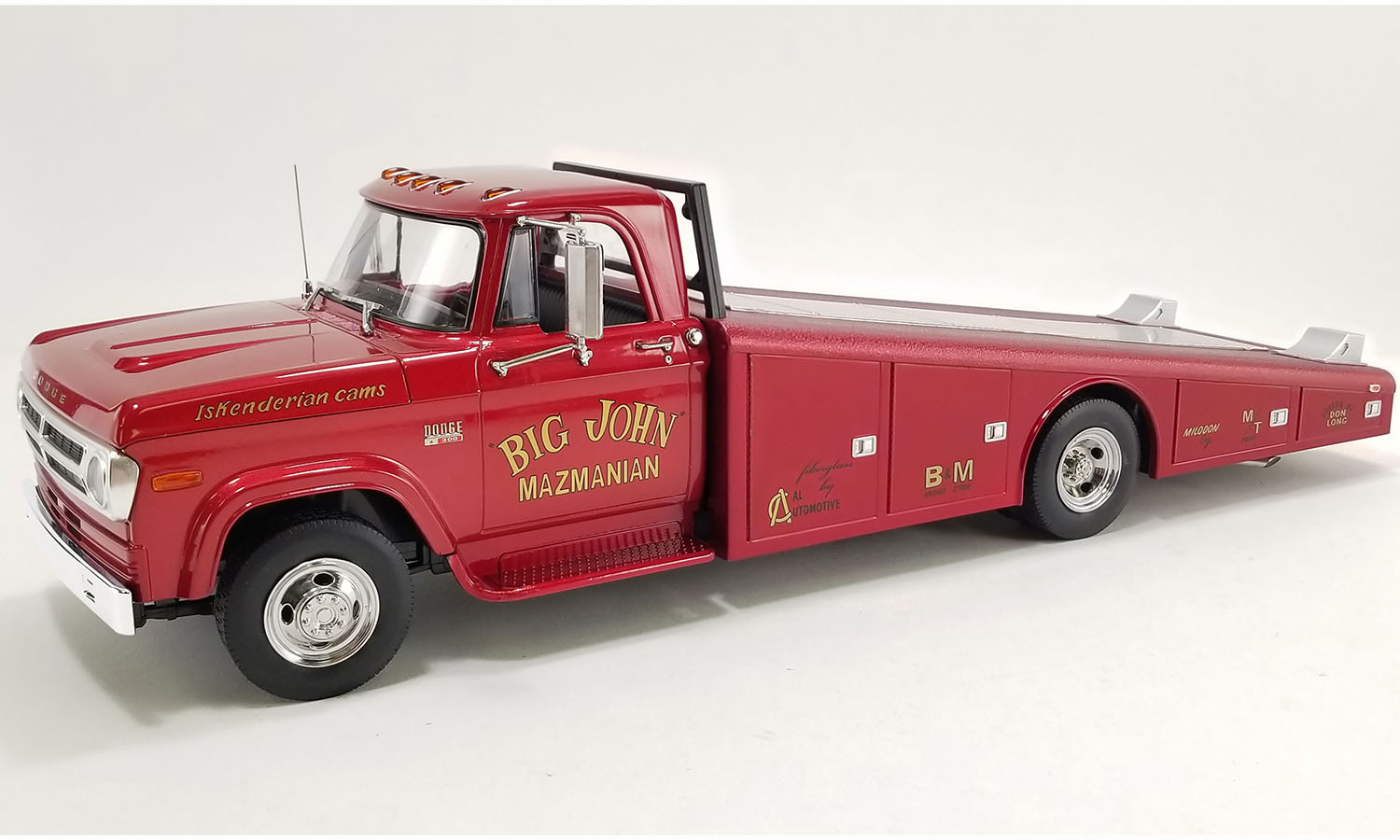 When you think of Big John Mazmanian, it immediately conjures up visions of immaculate, candy-apple-red cars—be they Corvettes, '40 Willys, chopped Austins, or the whole host of 'glass-bodied Funny Cars—powered by supercharged engines, most of which were early or late Chrysler Hemi's. This is a "must have" platform to display any of the Big John Mazmanian models in your collection. This Dodge D-300 ramp truck will be finished in Big John's favorite color, Candy Apple Red. It will pair up perfectly with the 1961 Chevrolet Corvette Gasser or the '41 Gasser!
