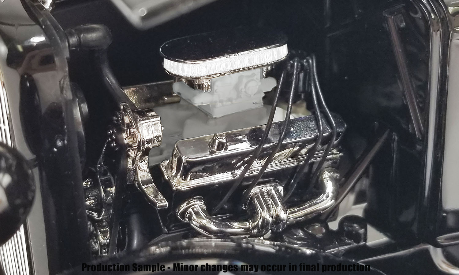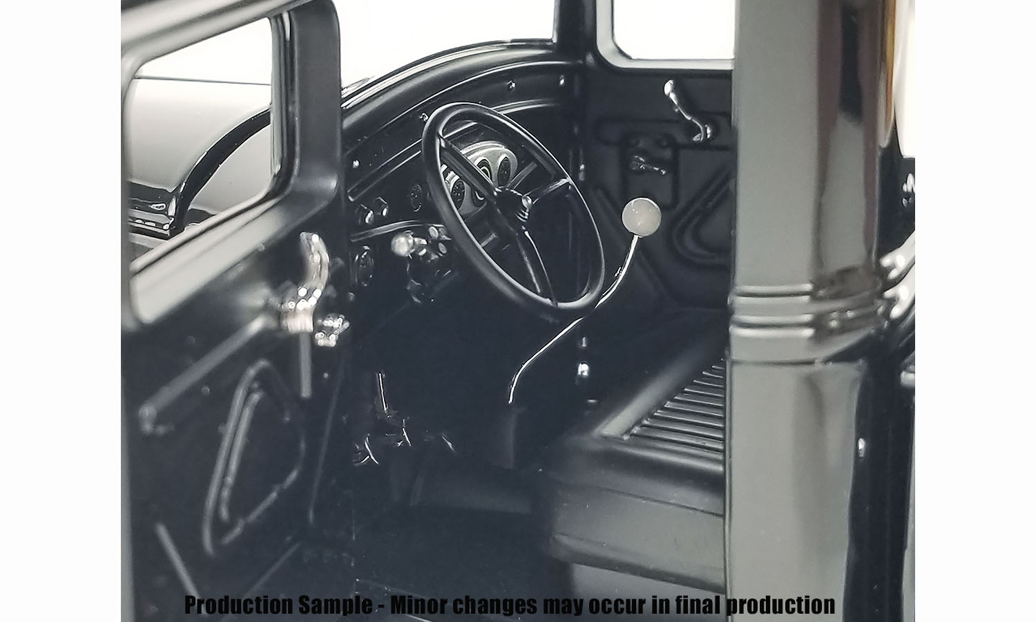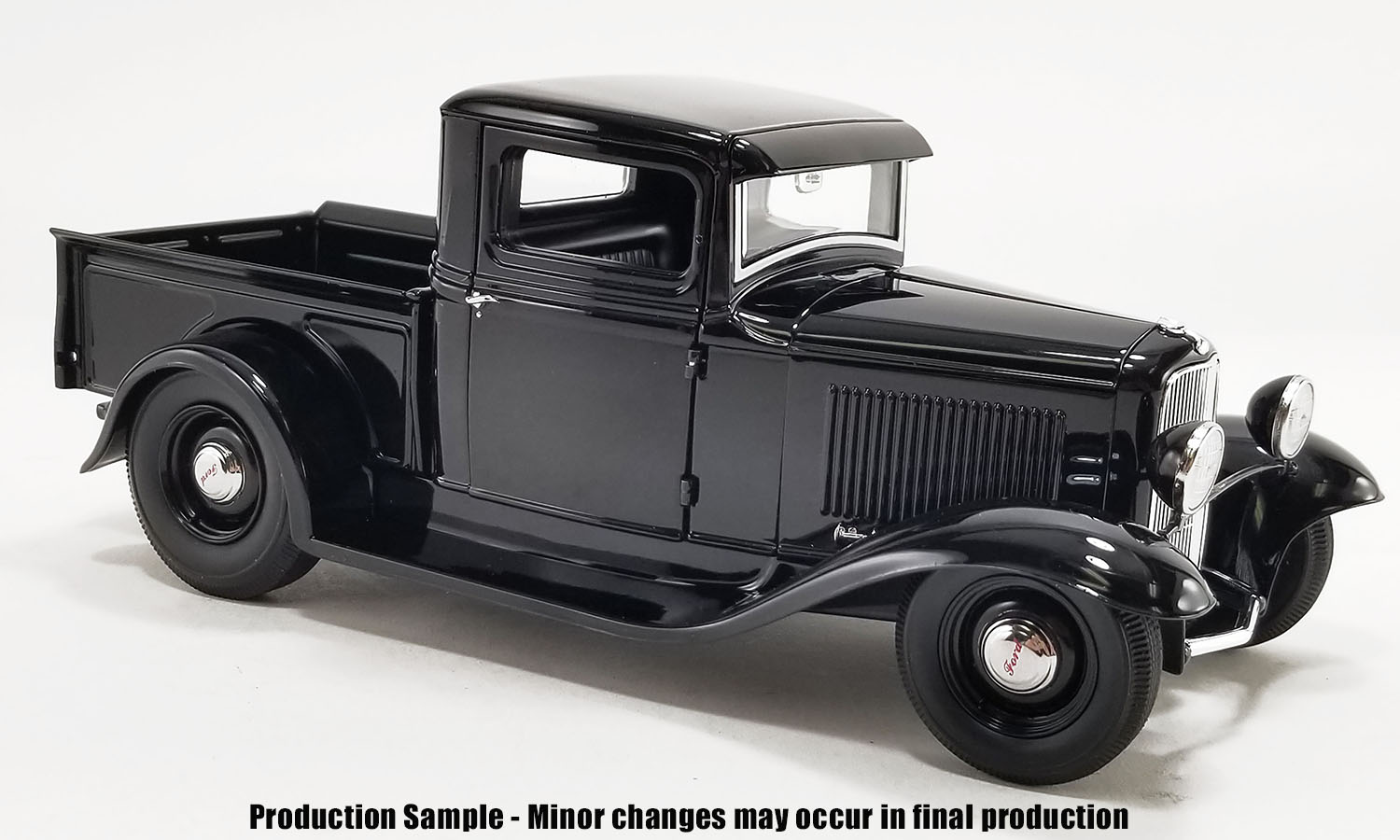 On the exterior, this custom 1932 Ford fendered pickup truck is decked out in an absolutely stunning high gloss black paint job and steel wheels with Ford baby moon center caps. The all black interior is the perfect complement to the exterior and features a fully detailed dashboard and steering wheel with turn signal lever. This black beauty won't sit still either as it's powered by a hot rod Chevy engine!