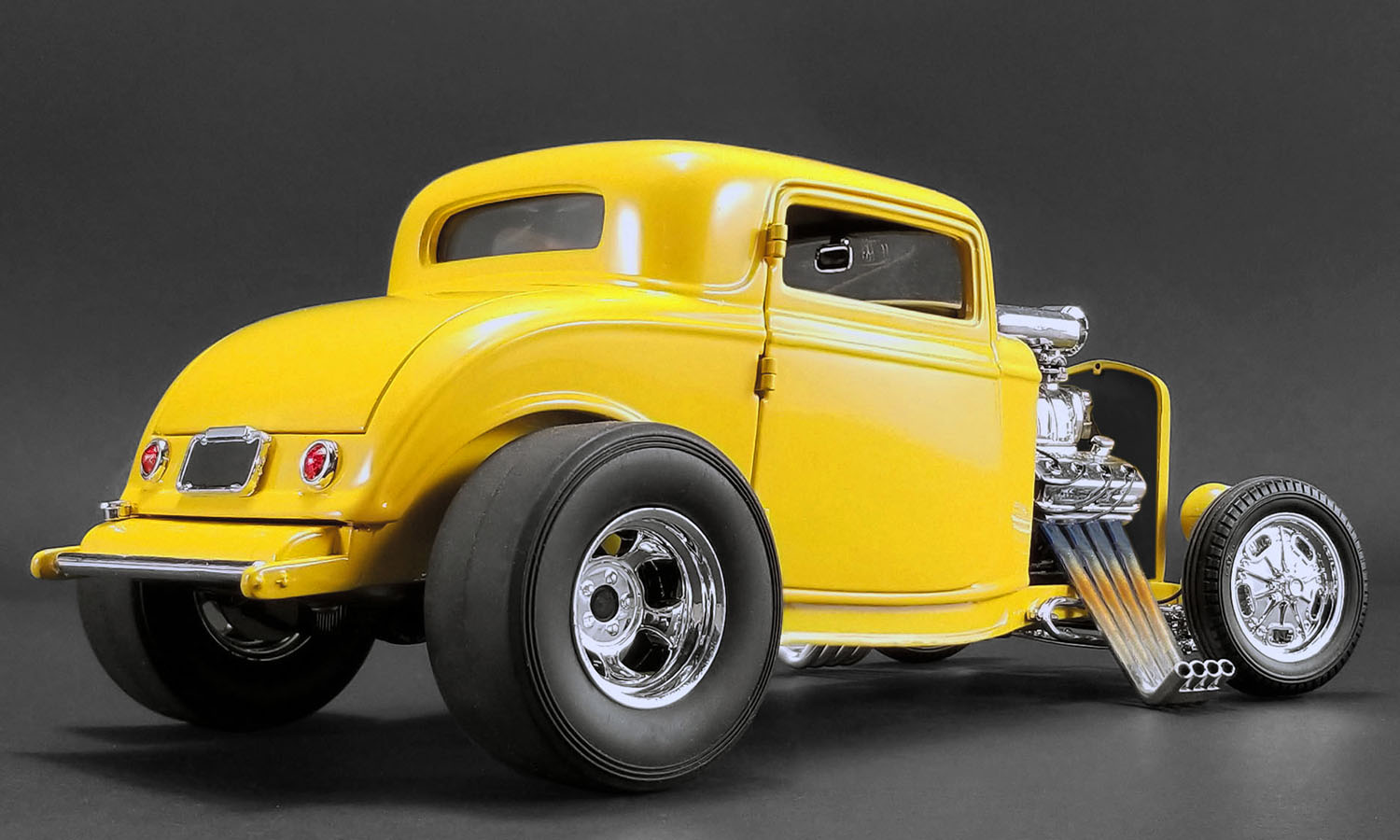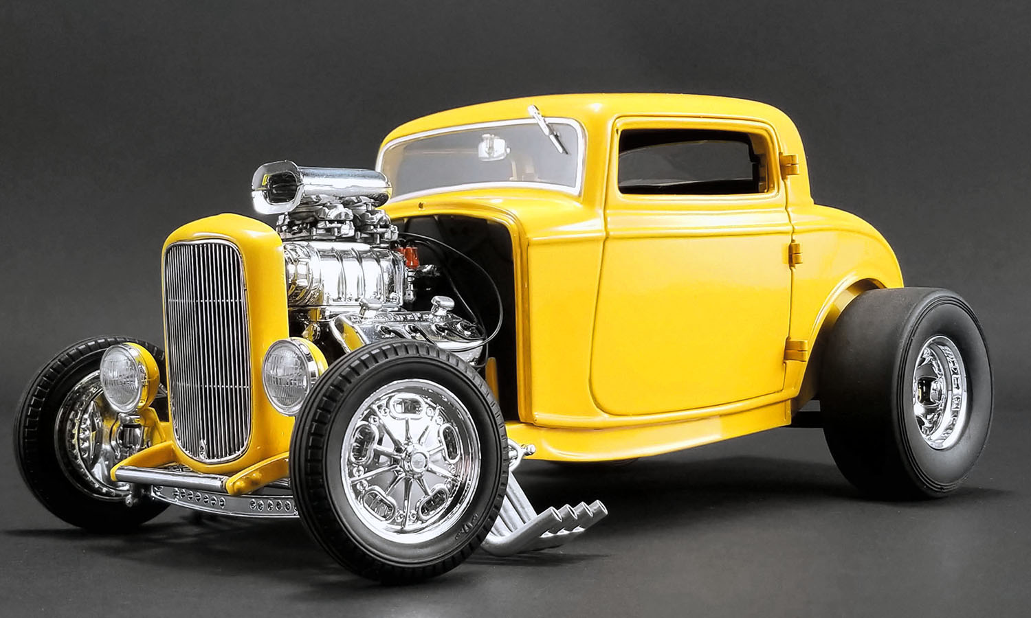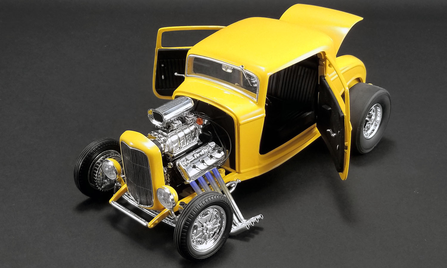 You will not want to miss this one! This model marks the first time that we have been able to outfit one of our '32s with a blown HEMI engine with zoomie headers and altered drag wheels and tires from the GMP tooling!