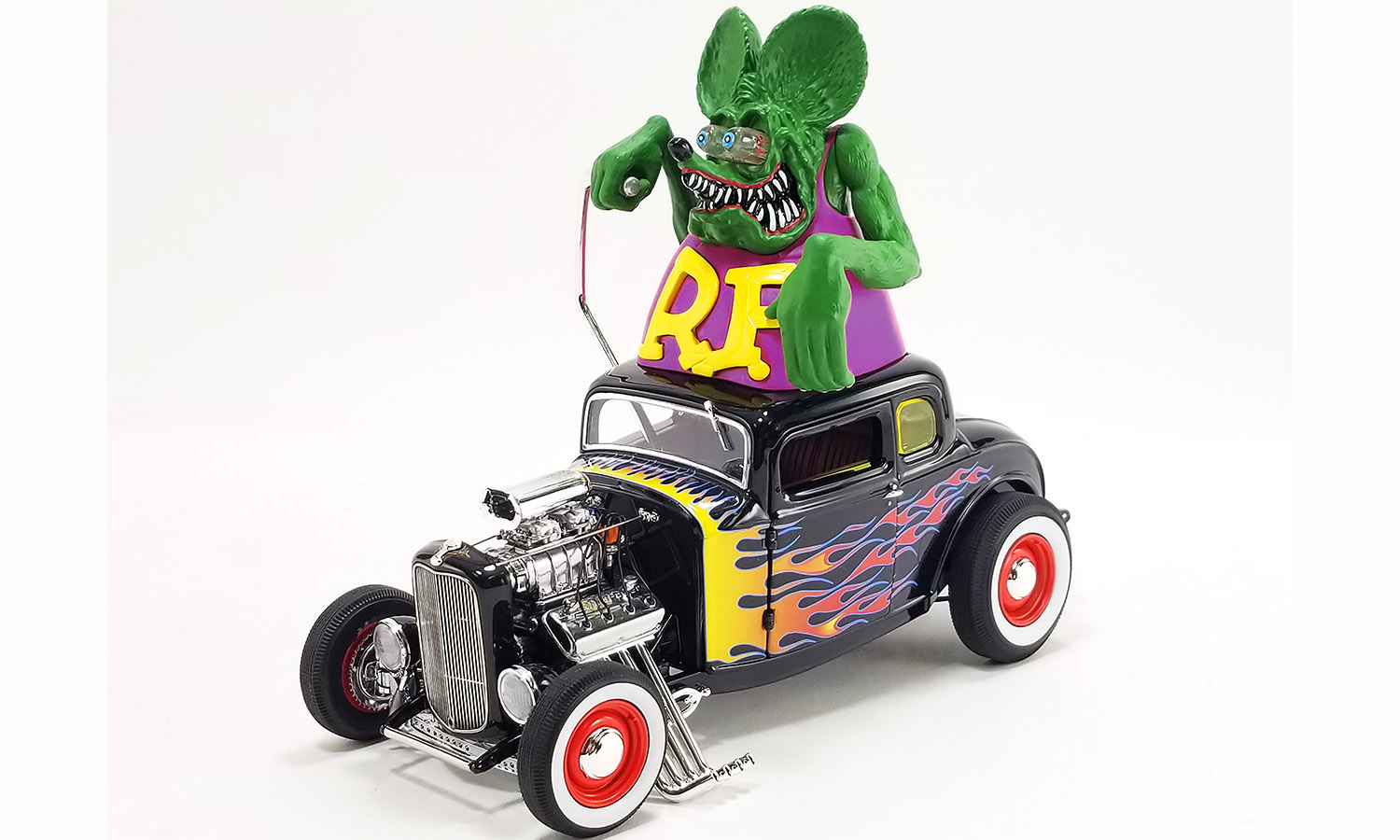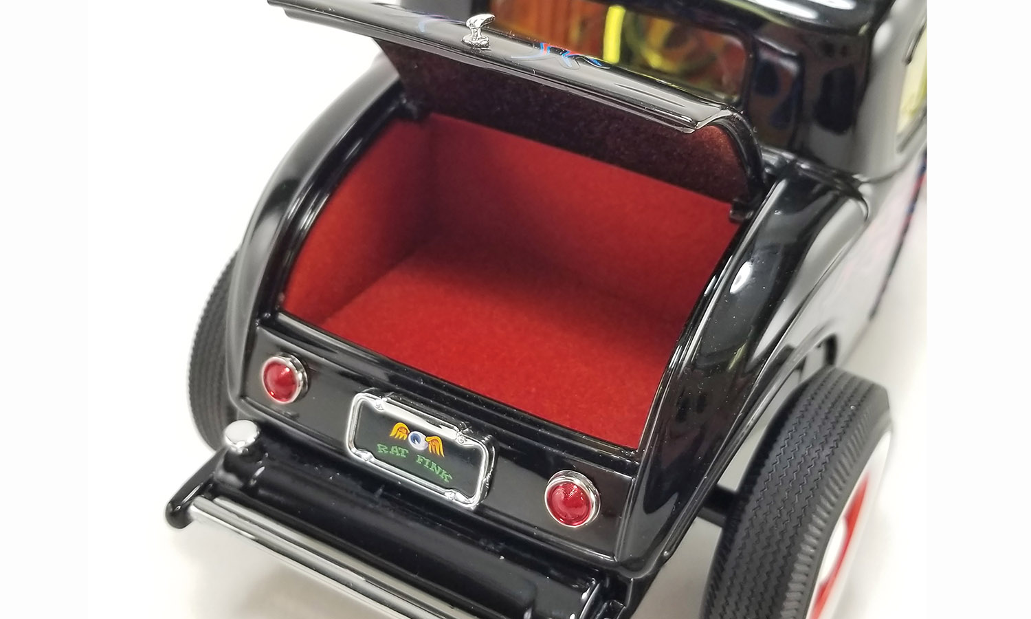 We're very excited to announce this 1932 Ford Blown 5 window complete with a Rat Fink figure at the helm. The Rat Fink figure comes with a shifter and fits into the roof opening just how Ed Roth depicted it in his drawings! The 32 Ford is finished in black paint with flames, sporting a blown Hemi engine with zoomie pipes, whitewall tires with poverty caps and so much more!