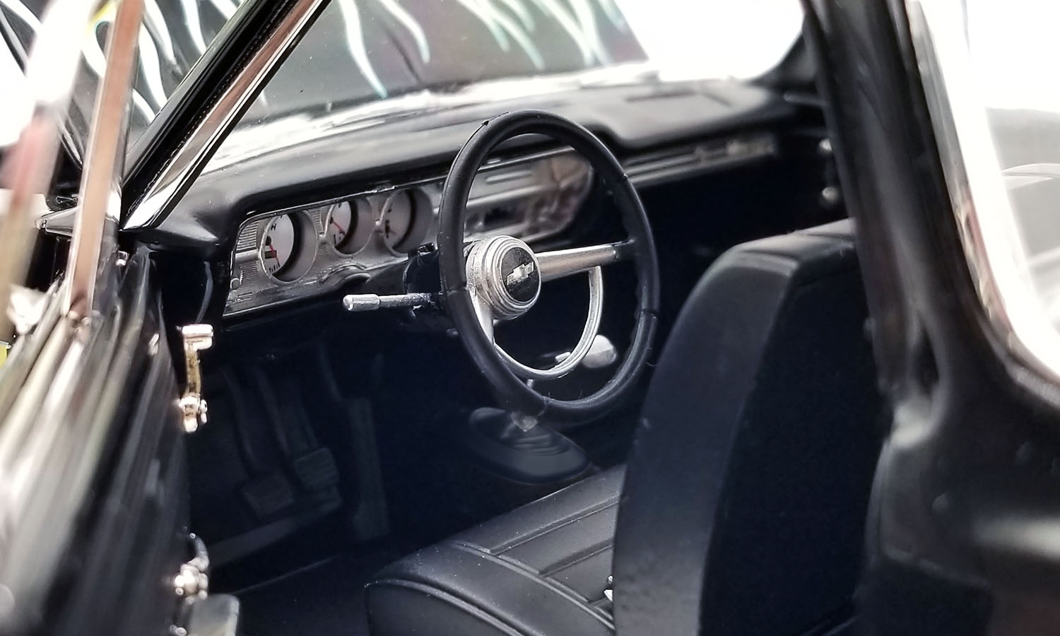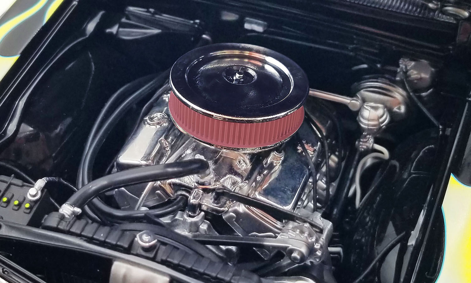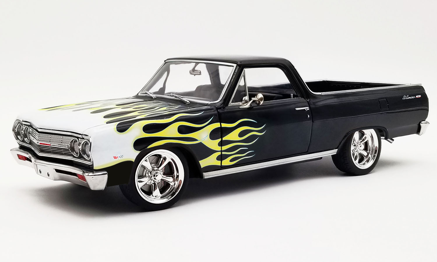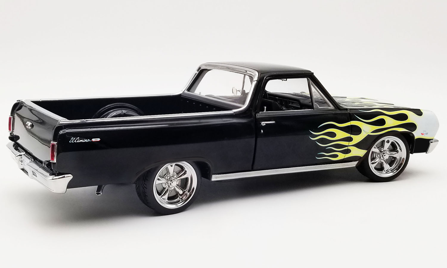 STRICTLY LIMITED TO 396 PIECES This El Camino features a stunning black paint job with white and yellow flames adorning the hood and fenders. Power comes from a built 396 engine that provides all the power needed to roast the Chrome Thrust wheels and tires, and  a fully detailed interior and chassis and functional tailgate round out most of the finer details of this beauty!