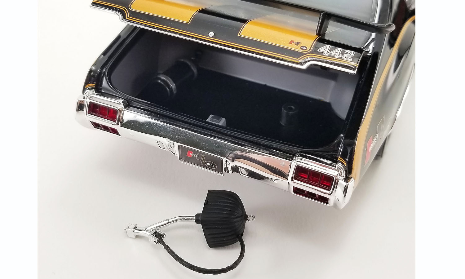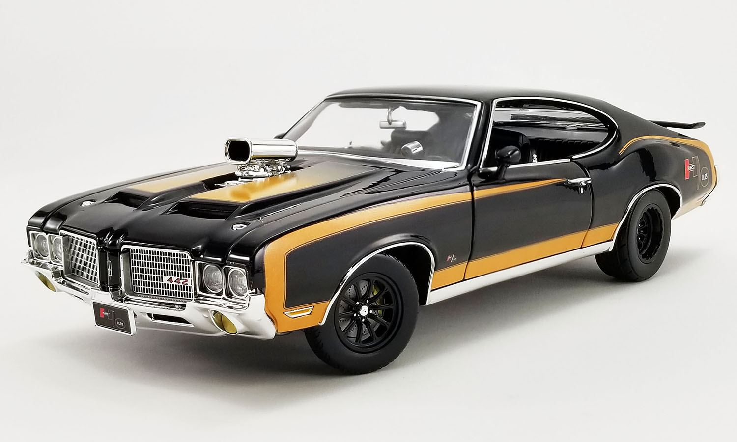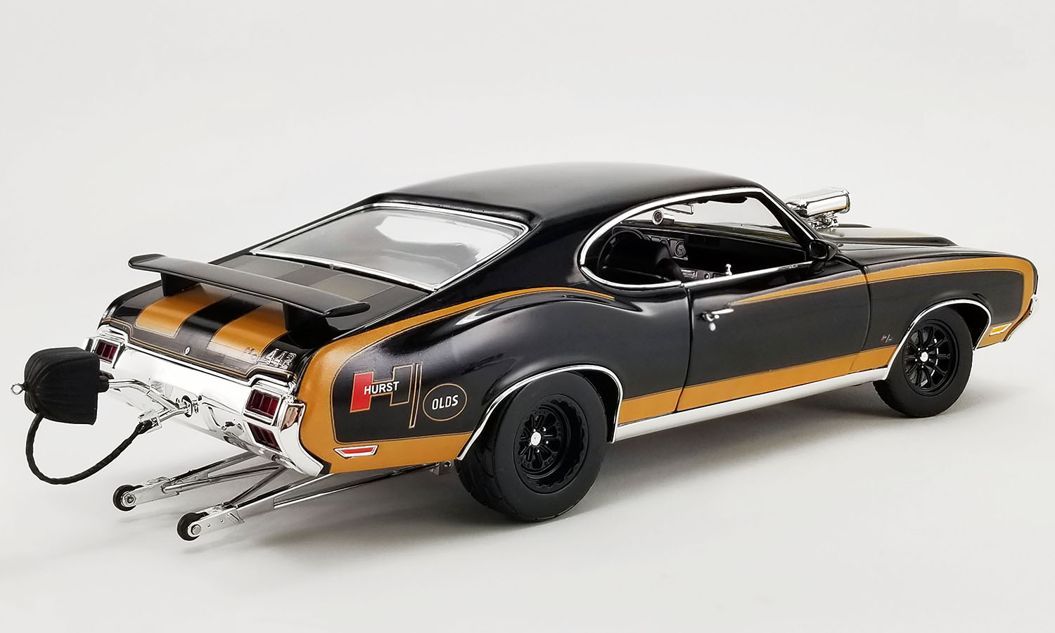 We're thrilled to bring you our first ever 1:18 Drag Outlaws 1972 Oldsmobile Hurst 442s! These will come in two awesome Hurst themed color combinations! One will be in the classic Hurst white with gold stripes and the other in the famous Hurst black with gold stripes scheme. Both models will feature a blown 455 engine, our new Drag Outlaws drag wheels and tires, drag parachute, wheelie bars and so much more!