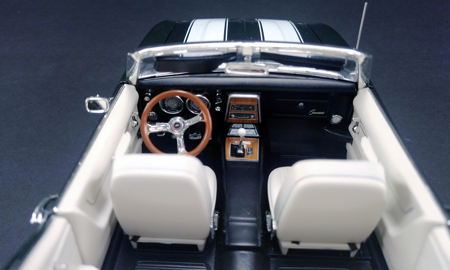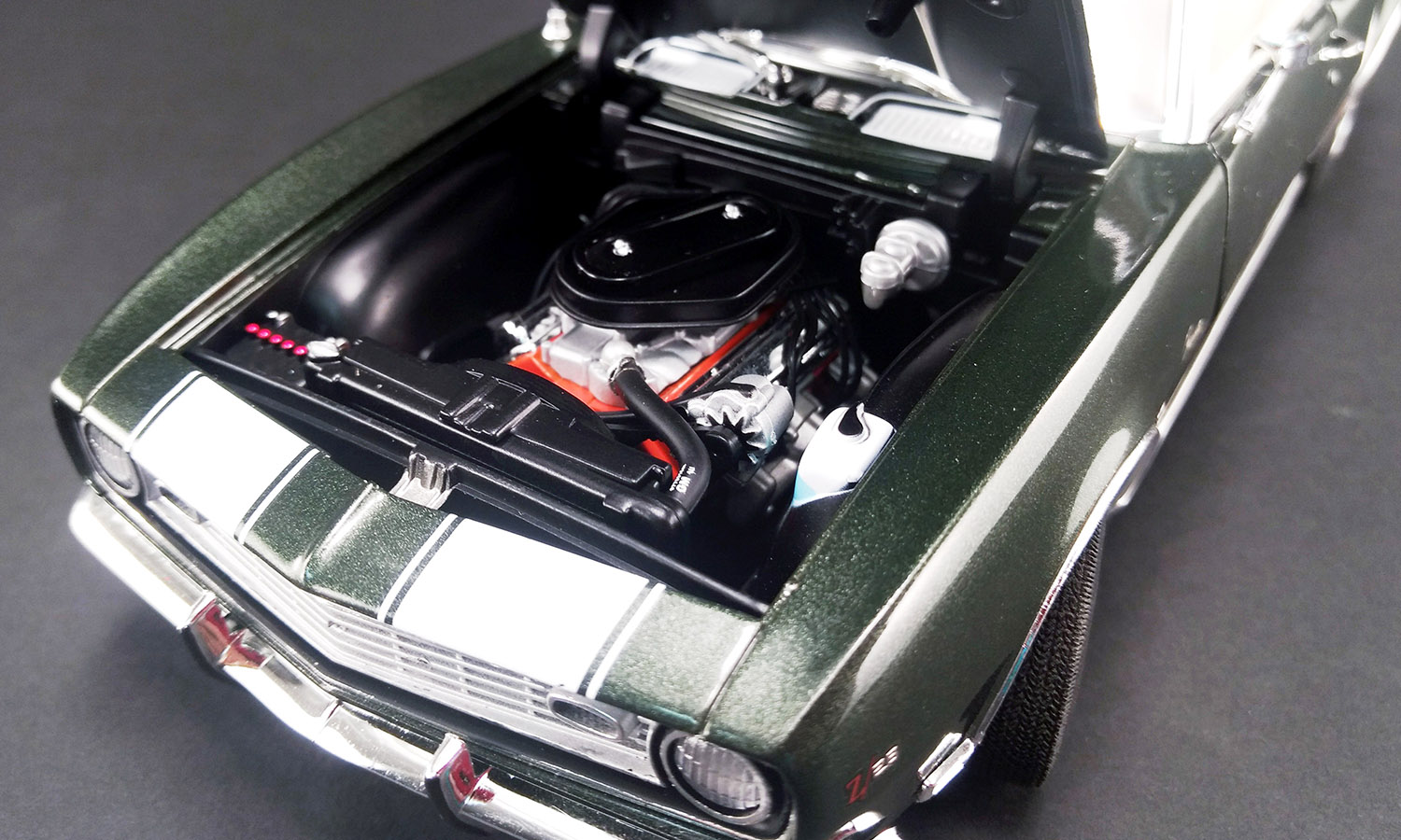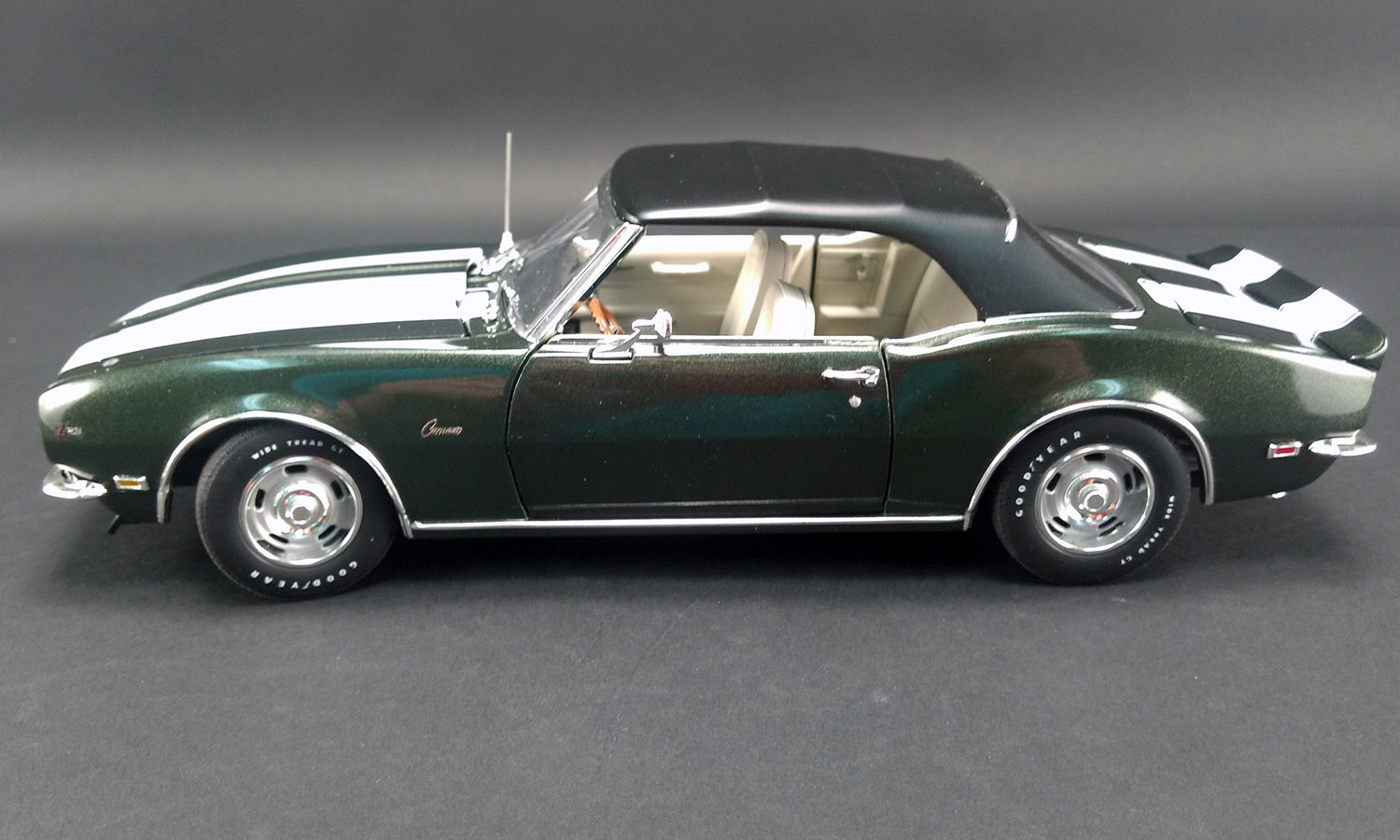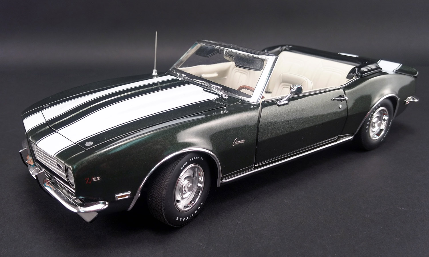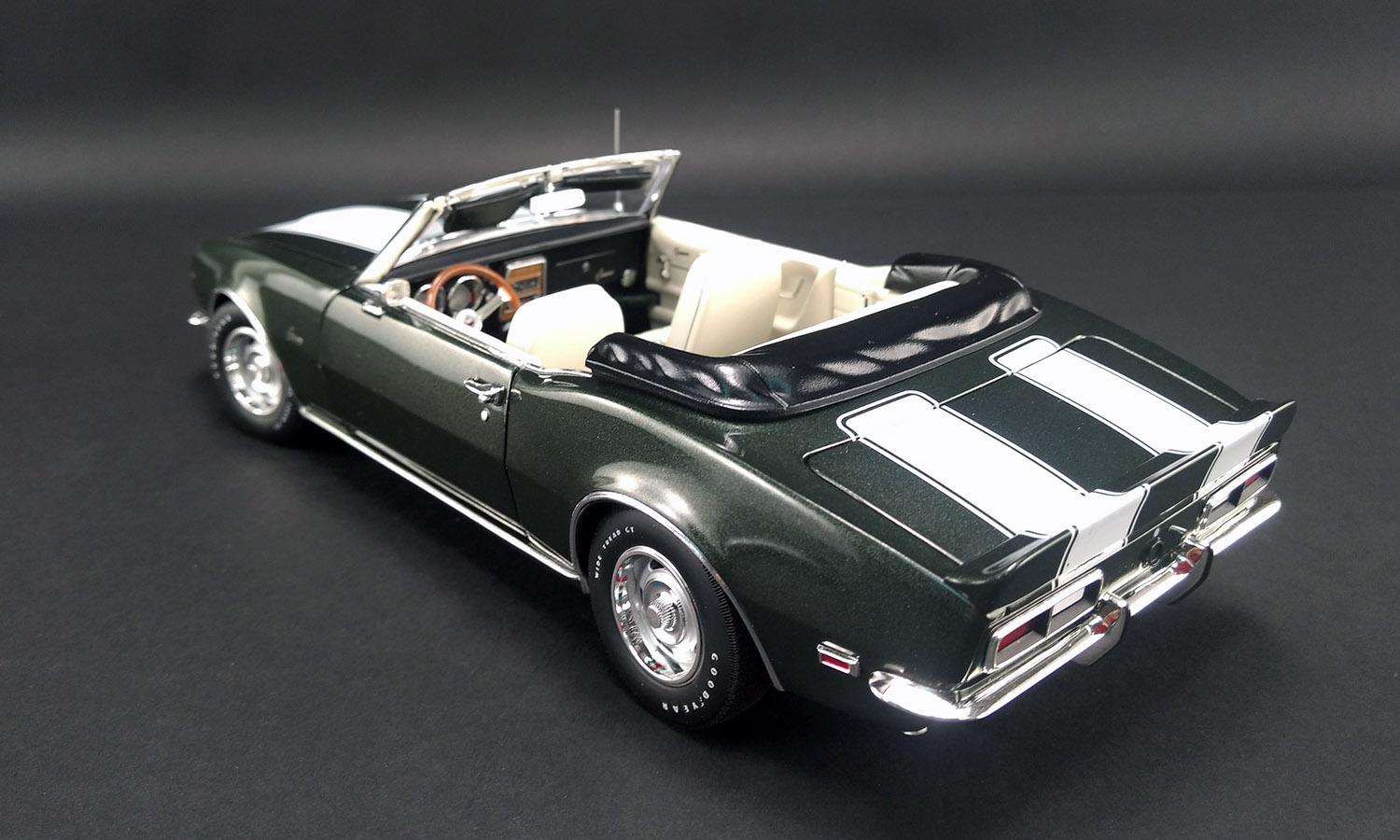 This Camaro convertible was ordered through the Fleet Special Order Department and assembled at GM’s Norwood,Ohio, plant on July 15, 1968. It was the only 68 Z/28 convertible built. The car was loaded with extras. It did not originally carry the performance options. They were added when the car was taken from the Executive Garage and sent to the GM Tech Center. Then it was taken back to the Executive Garage and made available for Estes to use. The car was finished in dark Fathom Green and had a folding rear seat, auxiliary console-mounted instrumentation, auxiliary lighting, power windows, a remote outside rearview mirror, custom seat belts, a blue light AM/FM stereo system, a rear window defroster, a Comforttilt steering wheel and posi-traction. Race parts included 4-wheel disc brakes, a performance suspension package with Koni shocks, a cowl plenum fiberglass hood (a prototype of the ‘69 Camaro fiberglass hood), a cross-ram intake and tube headers. ACME is proud to announce this tribute to the infamous one of one convertible ever made