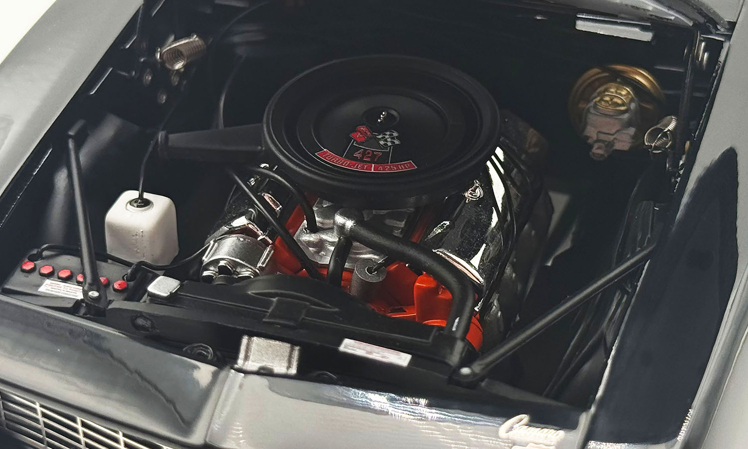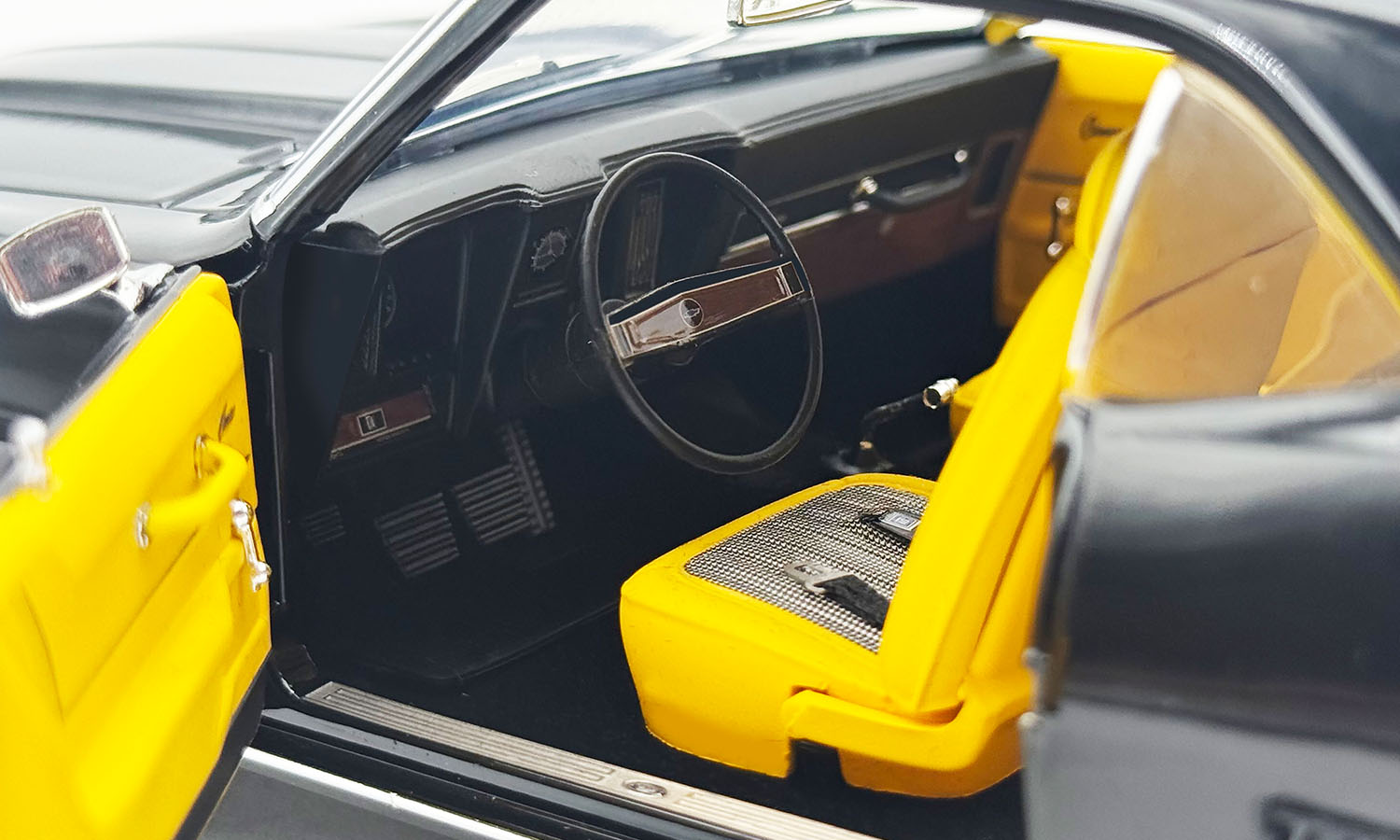 Finished in a deep Tuxedo Black paint, this 1969 Chevrolet COPO Camaro is the only COPO Camaro that was ordered with the rare code 714 yellow houndstooth interior! The model features a fully plumbed and wired COPO 427 engine, opening doors, hood, and trunk, a fully detailed interior with folding front seats, a fully detailed chassis and period correct Wide Tread tires mounted on black steel wheels with polished hubcaps and so much more! The Chevrolet 1969 COPO Camaros were intentionally designed to appear as a base model economy car. No Z/28 stripes, no SS badging, no RS hidden headlights, just plain jane hubcaps on a plain looking body. But, under an unassuming hood, lurked a monster 427 V8 engine that pumped out 425 horsepower!