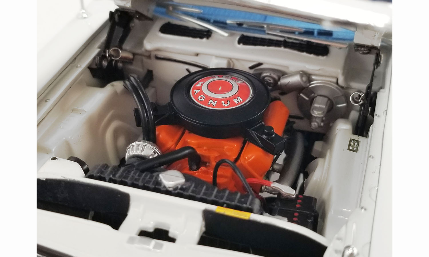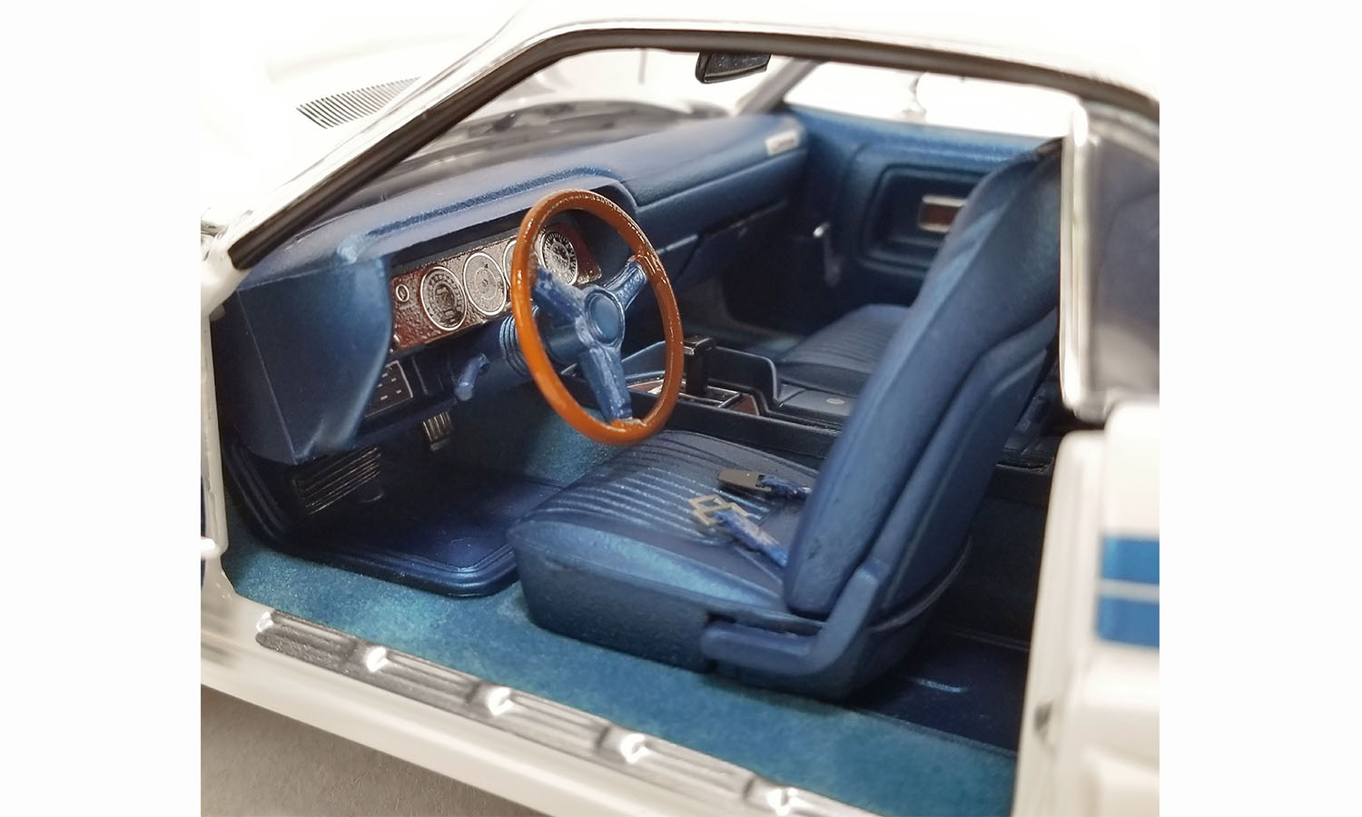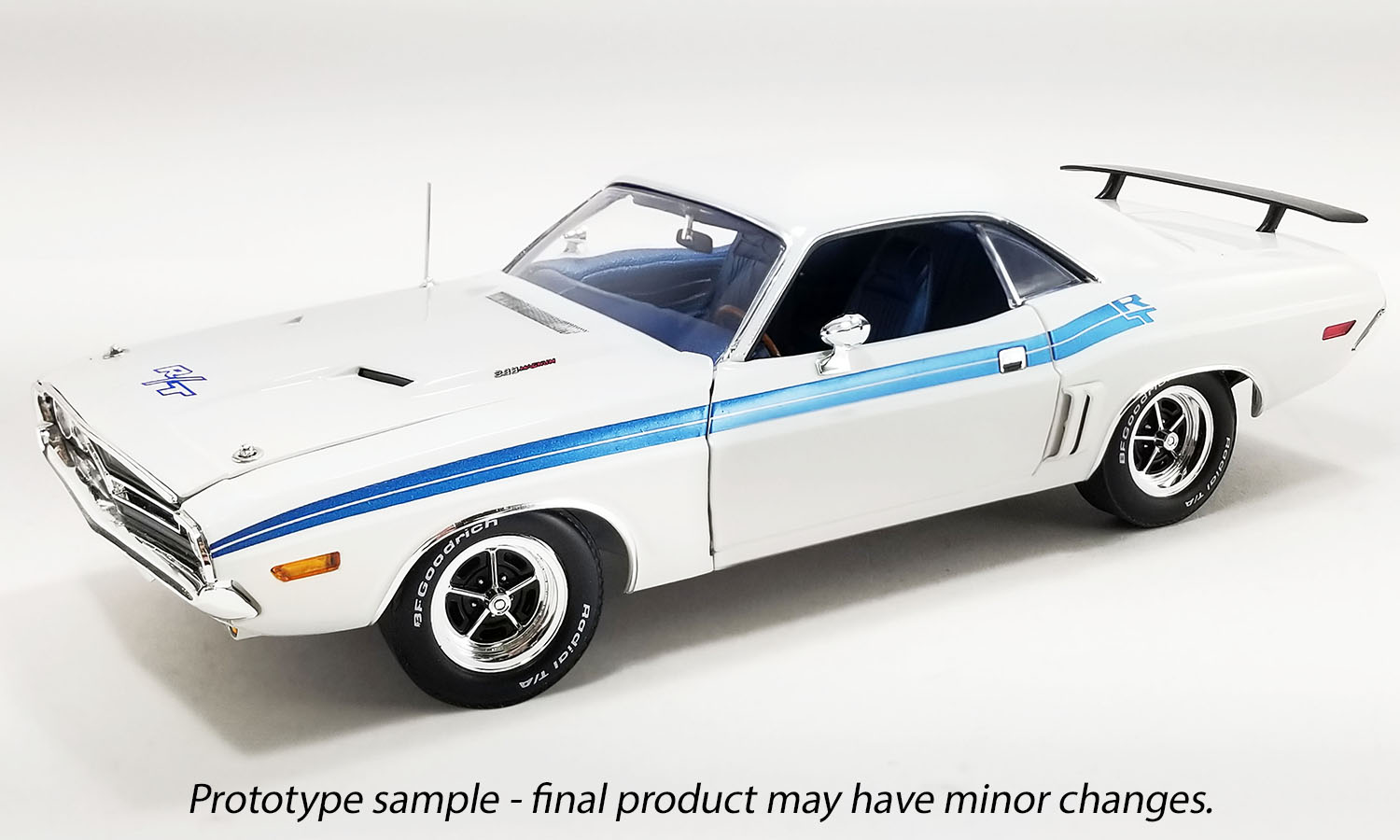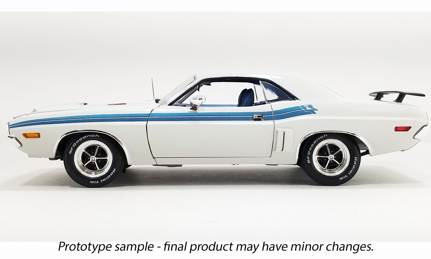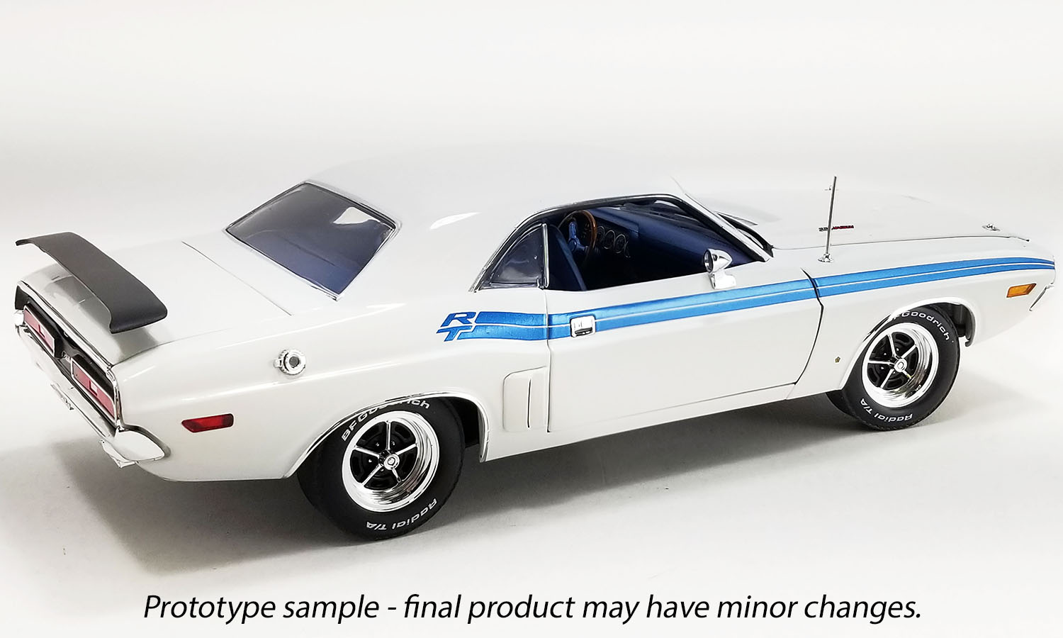 Don't miss out on this beautiful 1971 Dodge Challenger R/T! This Challenger is loaded with a 383 Magnum Engine, fully detailed interior, poseable steering, opening doors and hood and trunk and is finished off in beautiful Brite White paint job with blue R/T stripes.