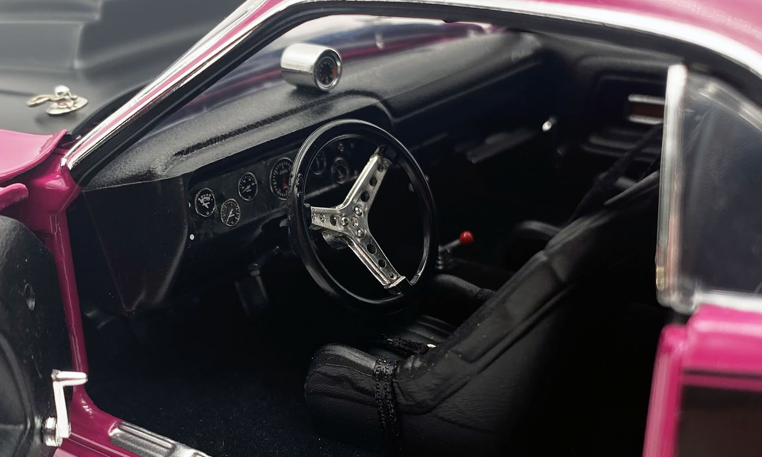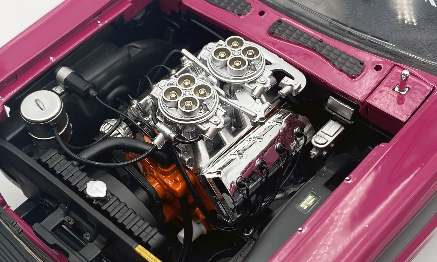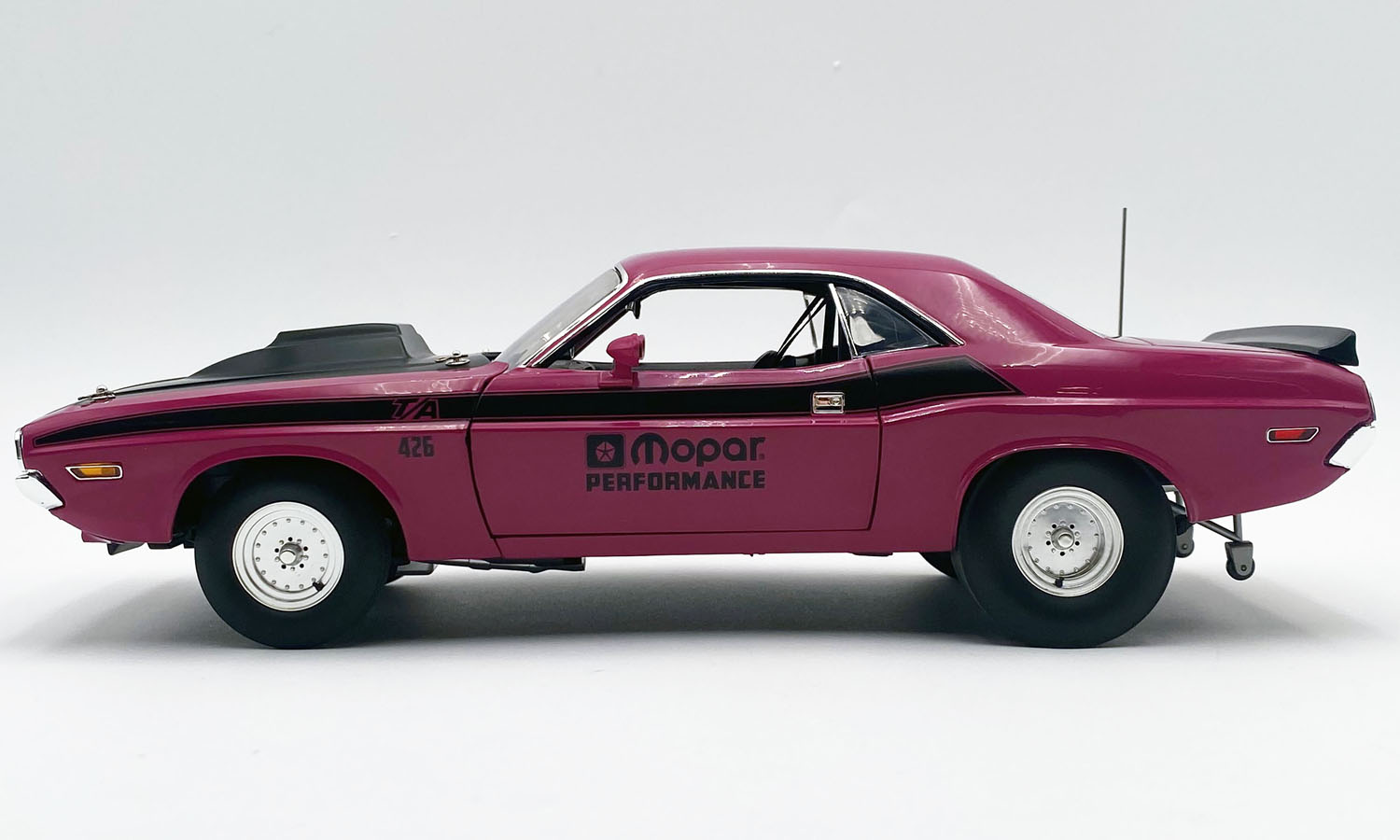 Don't miss out on this beautiful 1970 Dodge Challenger T/A Pro Stock! This Challenger is loaded with a 426 Race Engine, centerline drag wheel and tires, full race roll cage, fully detailed interior and race seats, poseable steering, opening doors and lift off hood and trunk and is finished off in beautiful Panther Pink paint job.