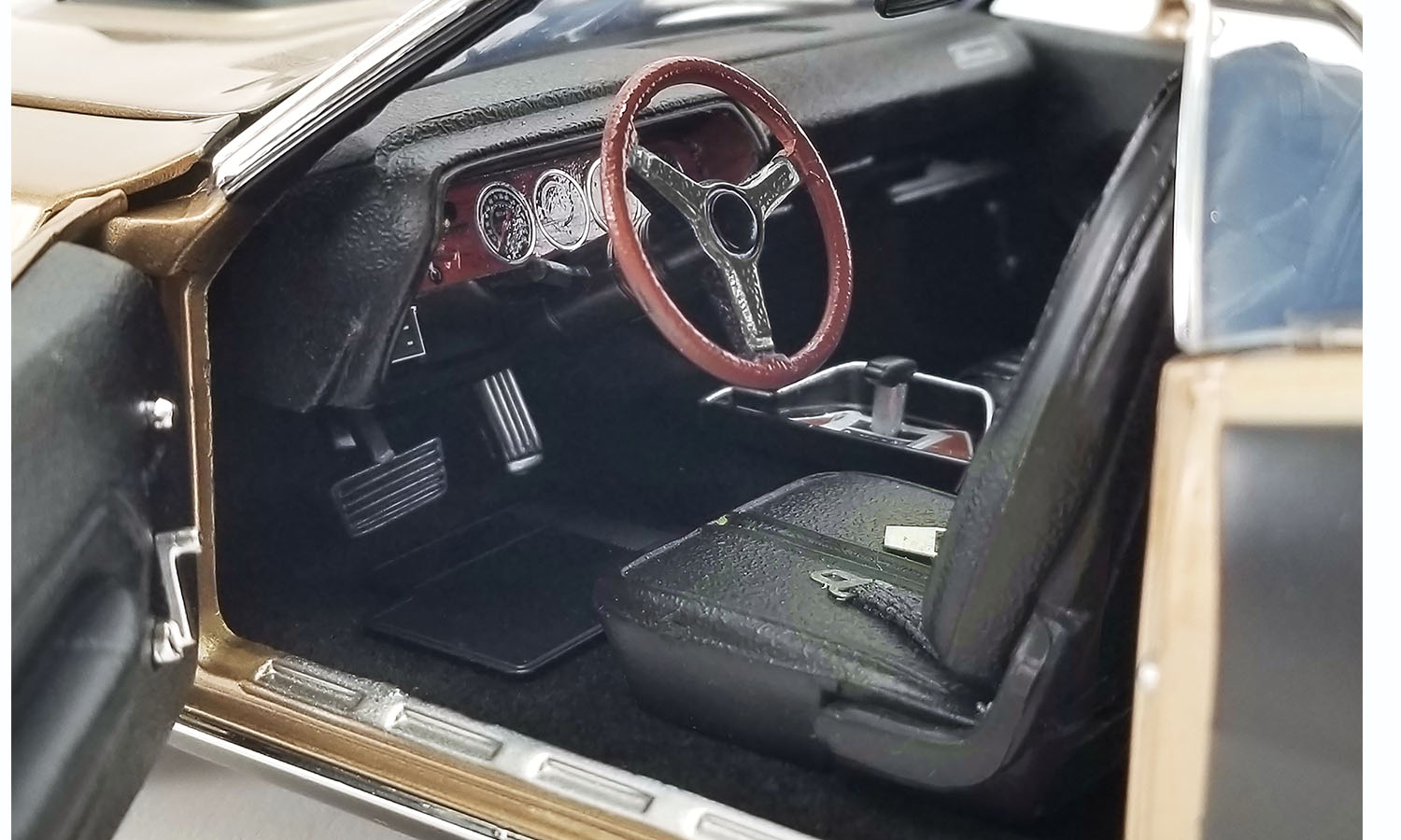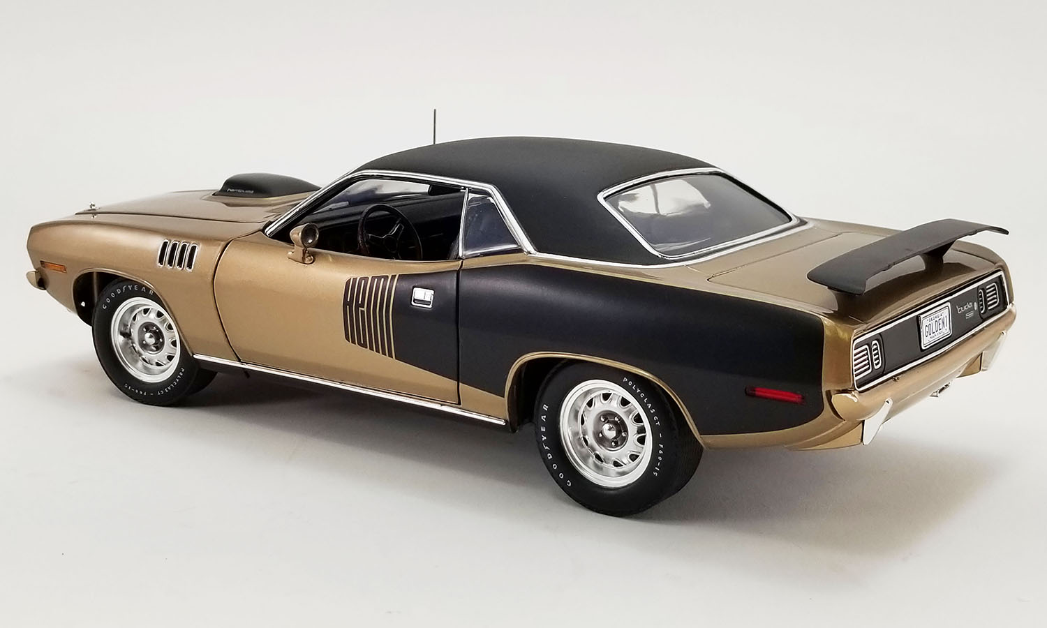 If there is a single car that typifies the finale of the American muscle-car era, it is the 1971 Plymouth Hemi Cuda! Under the Shaker scoop is the legendary Chrysler Hemi engine, birthed for NASCAR dominance and in its final production season in 1971 before bowing out due to government regulations and insurance premiums. Dual 4-barrel carburetors scream for mercy as they push fuel through the hemispherical cylinder heads, with dual exhaust emitting a fearsome roar. Only 108 hardtops were produced and this Hemi Cuda features the unique combination of Goldleaf Metallic paint coupled to black Hemi billboard striping.