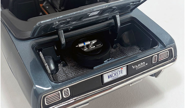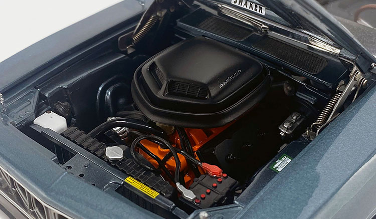 Among the many reasons why this HEMI is exceptional is the factory A833 four-speed manual transmission paired with a Hurst Pistol Grip shifter and, under the hood, a savage HEMI engine. Only three came equipped with this option. The Winchester Gray 'Cuda features a black Shaker scoop, a V3X option code black top, black billboard graphics, and Rallye wheels wrapped in F60-15 Goodyear Polyglas GT tires.