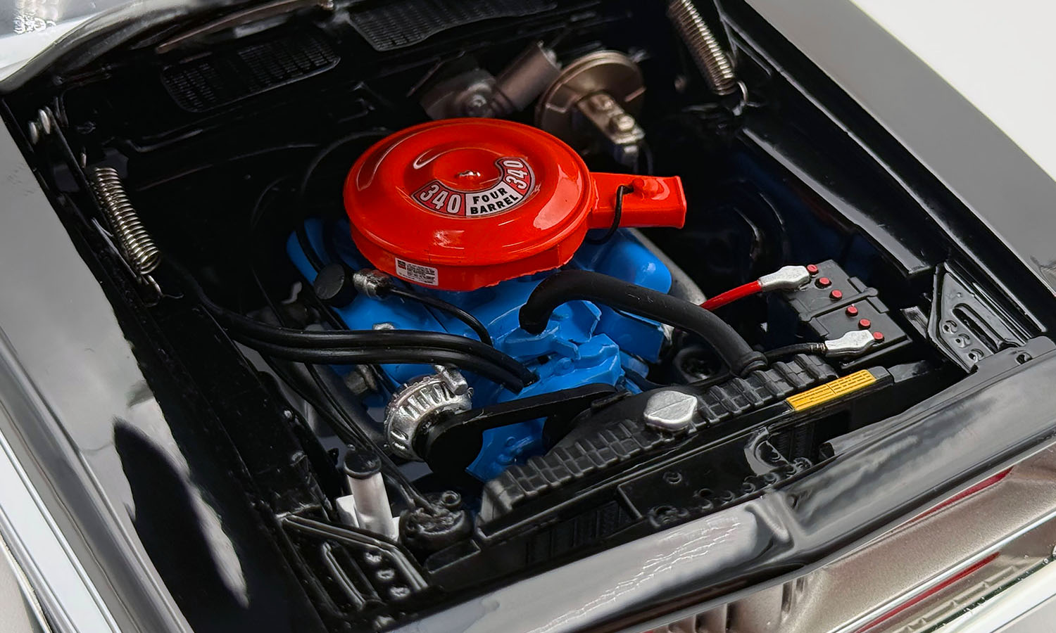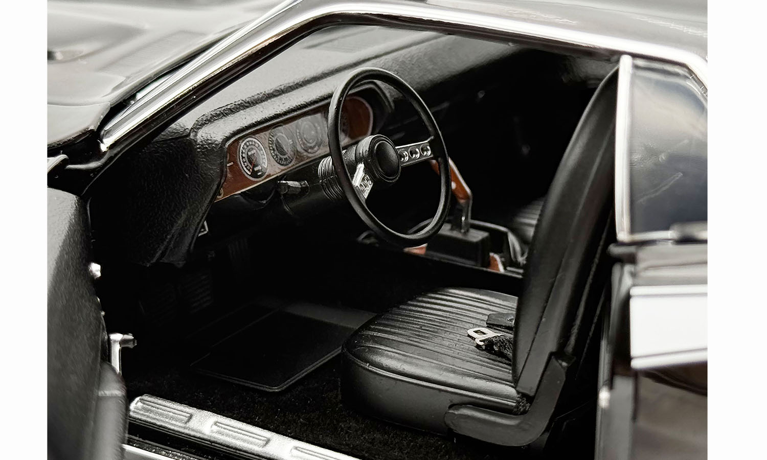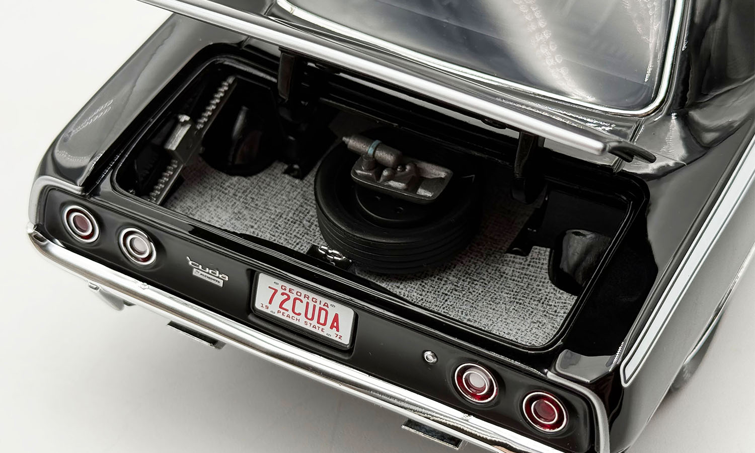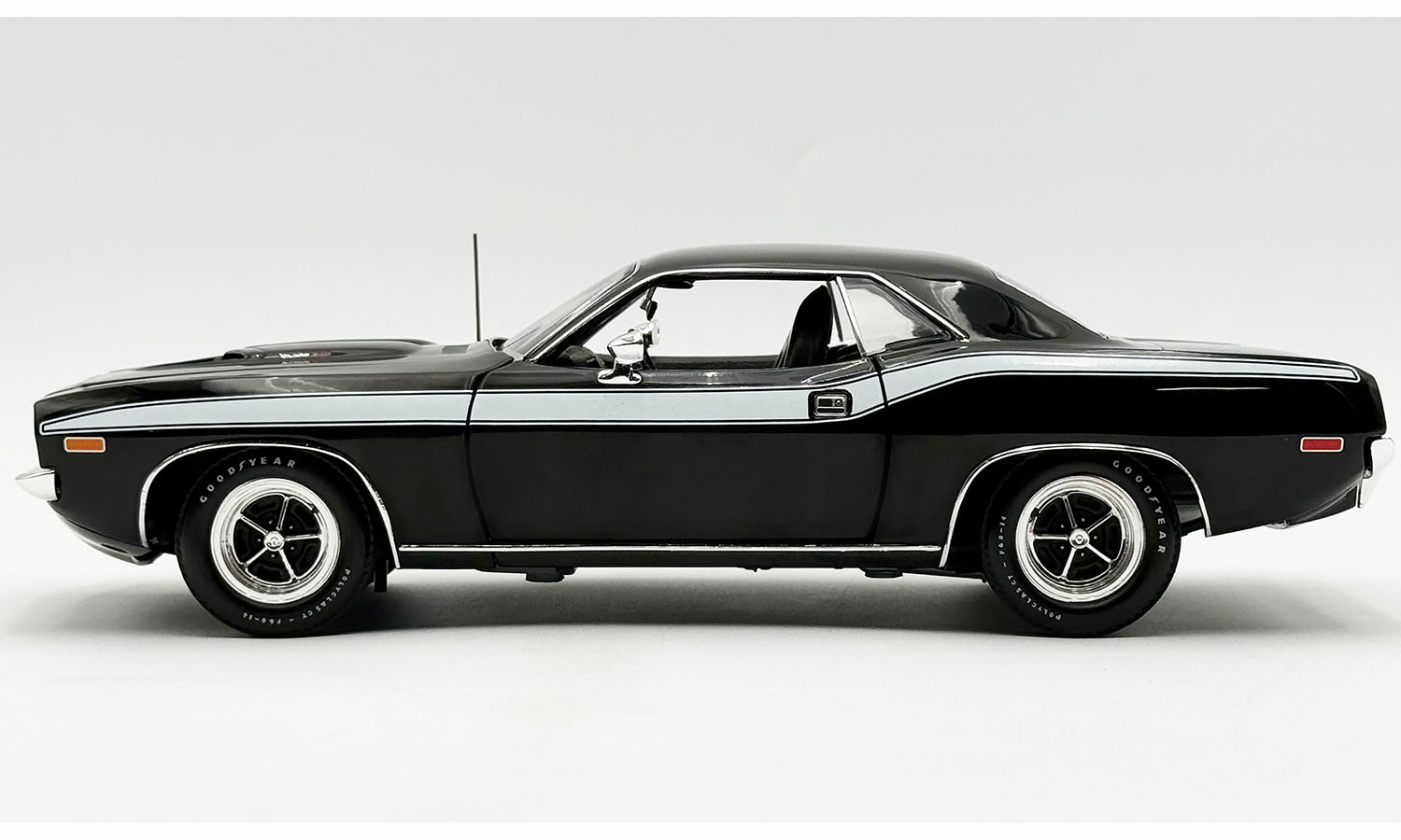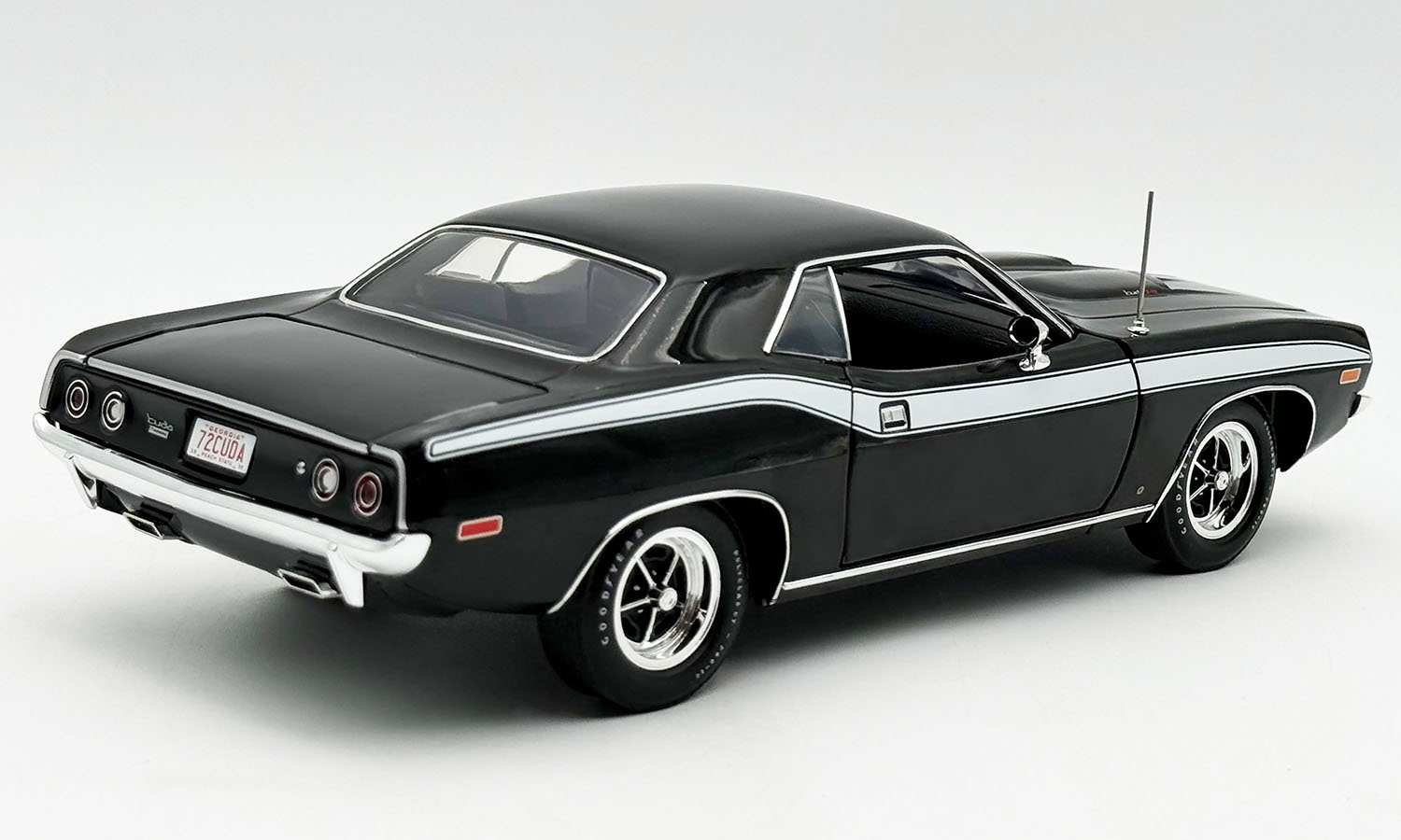 Limited to Just 150 Pieces! For all Mopar enthusiasts who are in love with Plymouth cars, then this third generation 'Cuda 340 is a must have. This beauty is decked out in a rare factory Black color, complemented with White striping making this 1972 Plymouth 'Cuda a head turning muscle car. The interior features folding tall black bucket seats with black door panels, detailed dashboard and a pistol grip shifter.