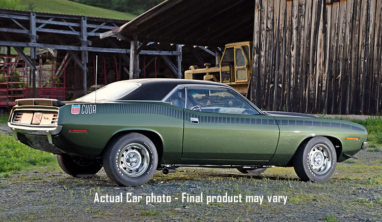This Plymouth AAR Cuda sports a gorgeous Ivy Green paint with the strobe stripes down the side and a beautiful green interior! Under the hood a fully detailed 340 engine with dual exhaust sending power to the Rallye wheels and tires and so much more!! The car's namesake was the AAR (All American Racers) Plymouth Barracudas that were campaigned by famed racer Dan Gurney's team in the SCCA-sanctioned Trans-Am series.