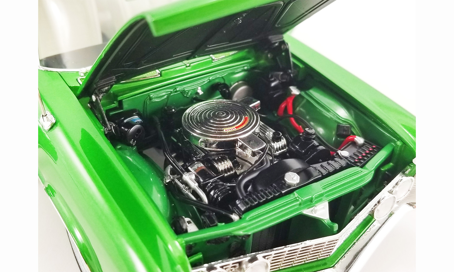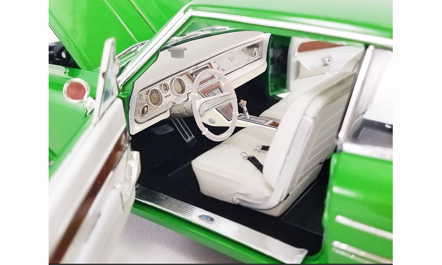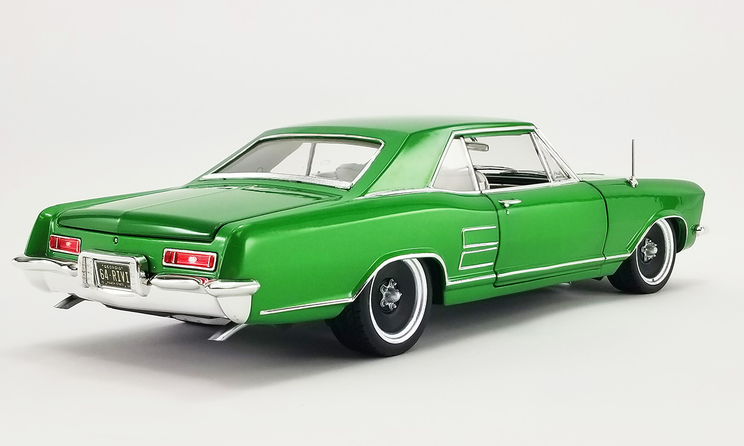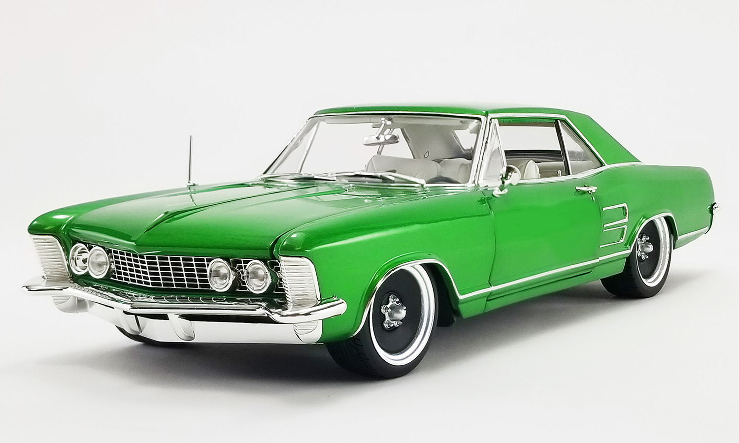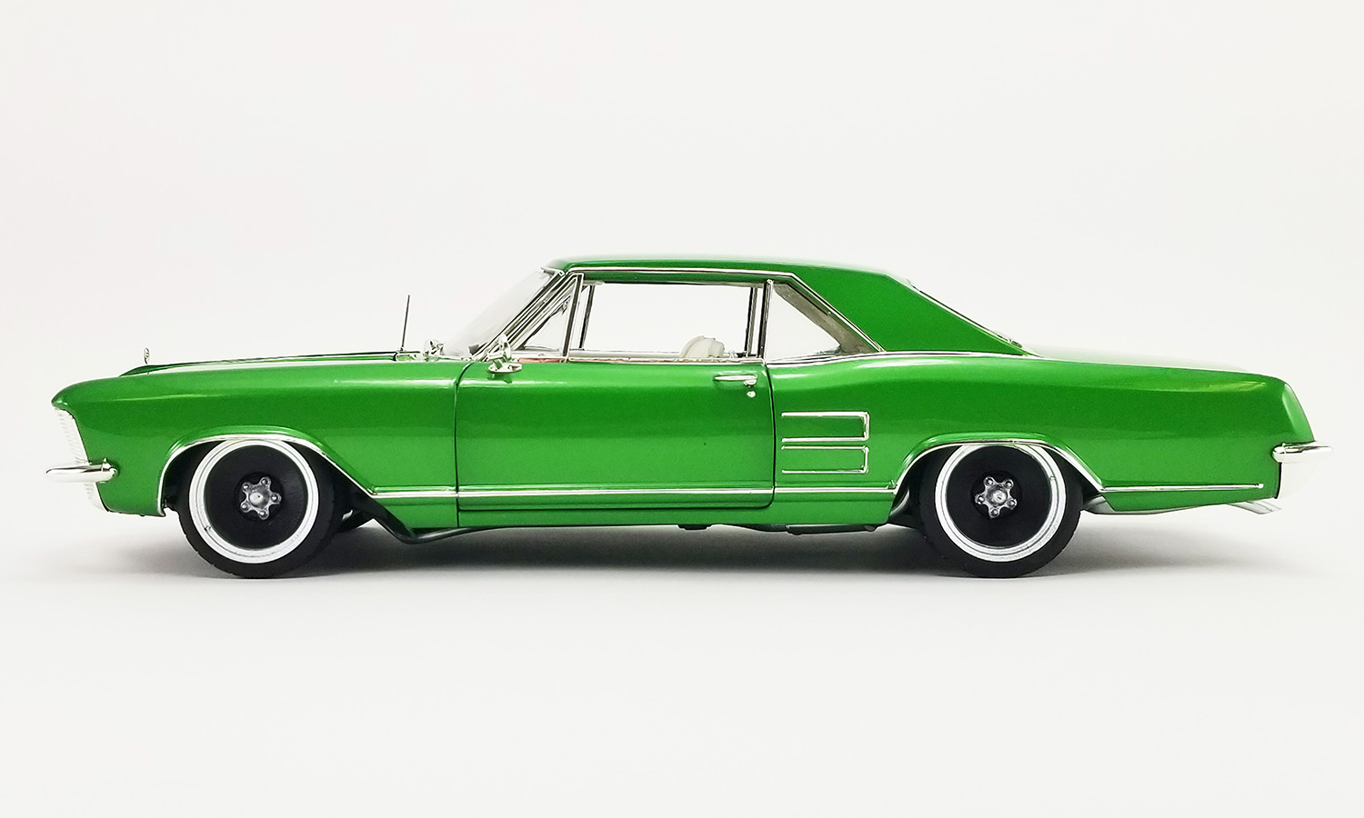 The first two releases in the Southern Kings Custom series will be these two drop dead gorgeous 1964 Buick Rivieras. One is finished in an amazing Cosmic Dust Green Metallic color with the other featuring a beautiful Cosmic Dust Blue Metallic finish. Both feature a fully customized white interior and some chrome detailing on the engine. To finish these two customs off, we have tooled up a brand new wheel called the Smoothie. This is a killer wheel design that perfectly complements these custom cruisers!