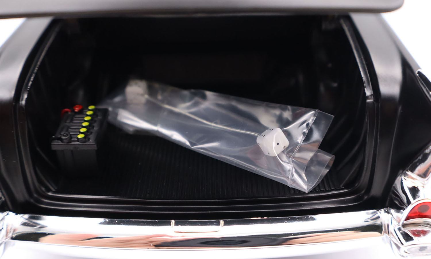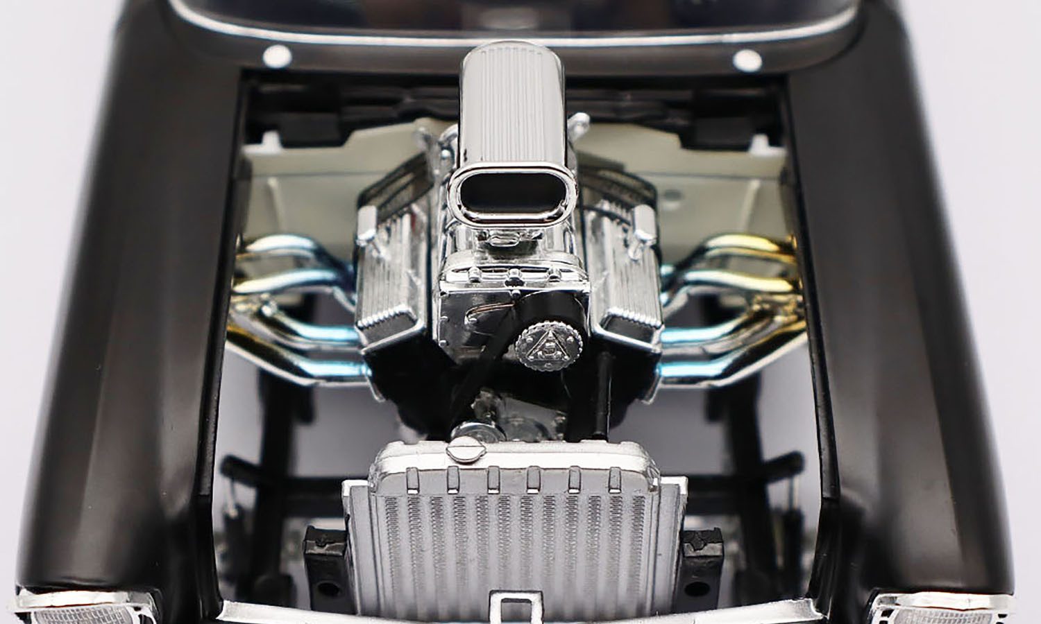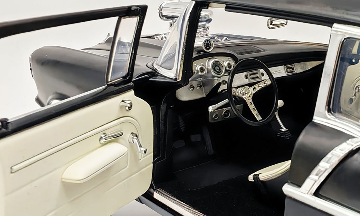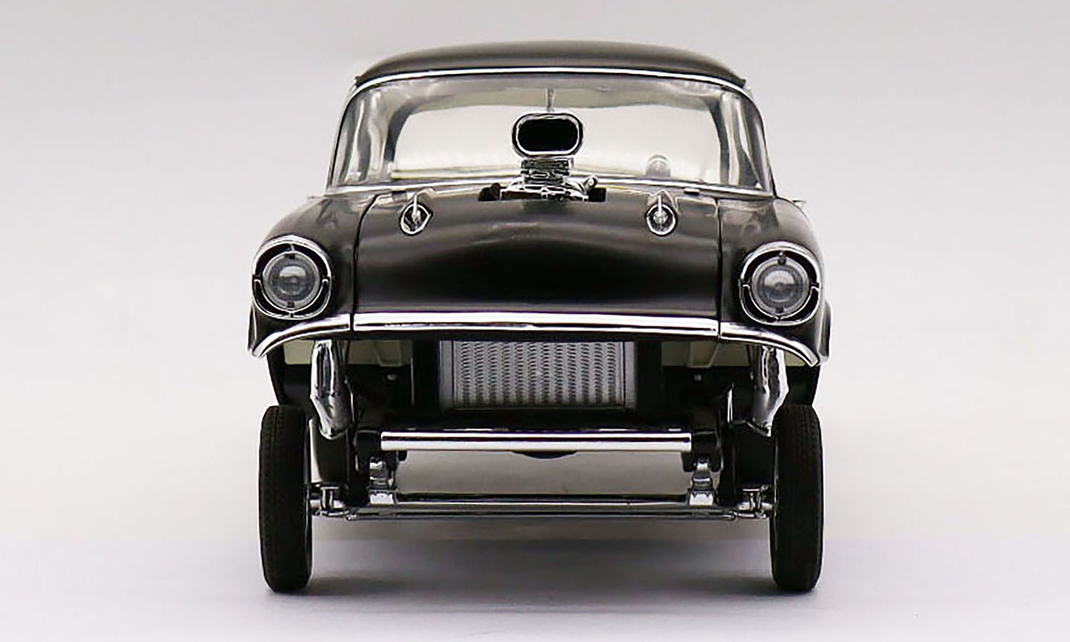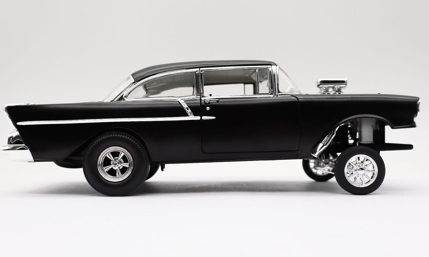 This 1957 Chevrolet 150 Gasser Prime Time is finished in a stunning satin Black paint finish with chrome gasser drag wheels and tires. The lift off hood reveals a blown 427 engine with a fully detailed chassis. Fully featured interior with opening doors and trunk and so much more!