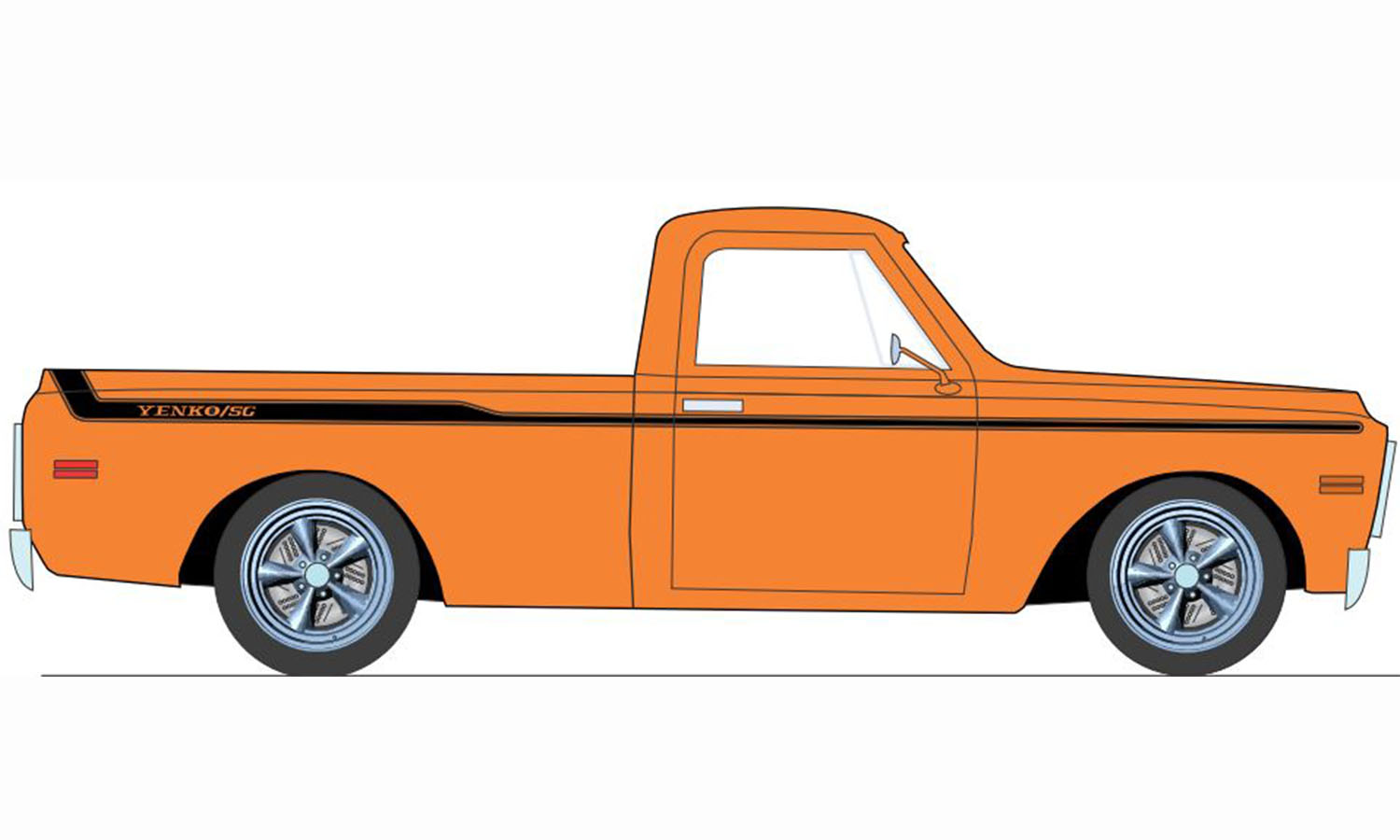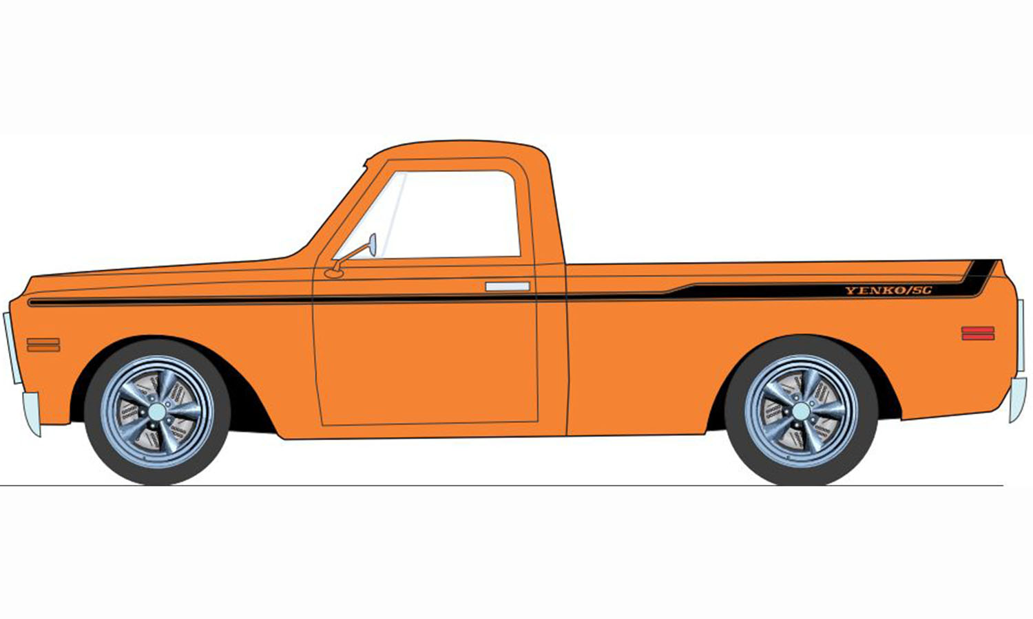What better addition could your Yenko collection get than a custom 1969 Yenko C-10? Check out this awesome 1969 Chevrolet C-10 Yenko edition finished in Hugger Orange with 1969 Yenko themed stripes with some brand new Smooth Spoke Torque Thrust 18" Wheels! This is a newly tooled wheel and tire set that is available as an accessory set as well!