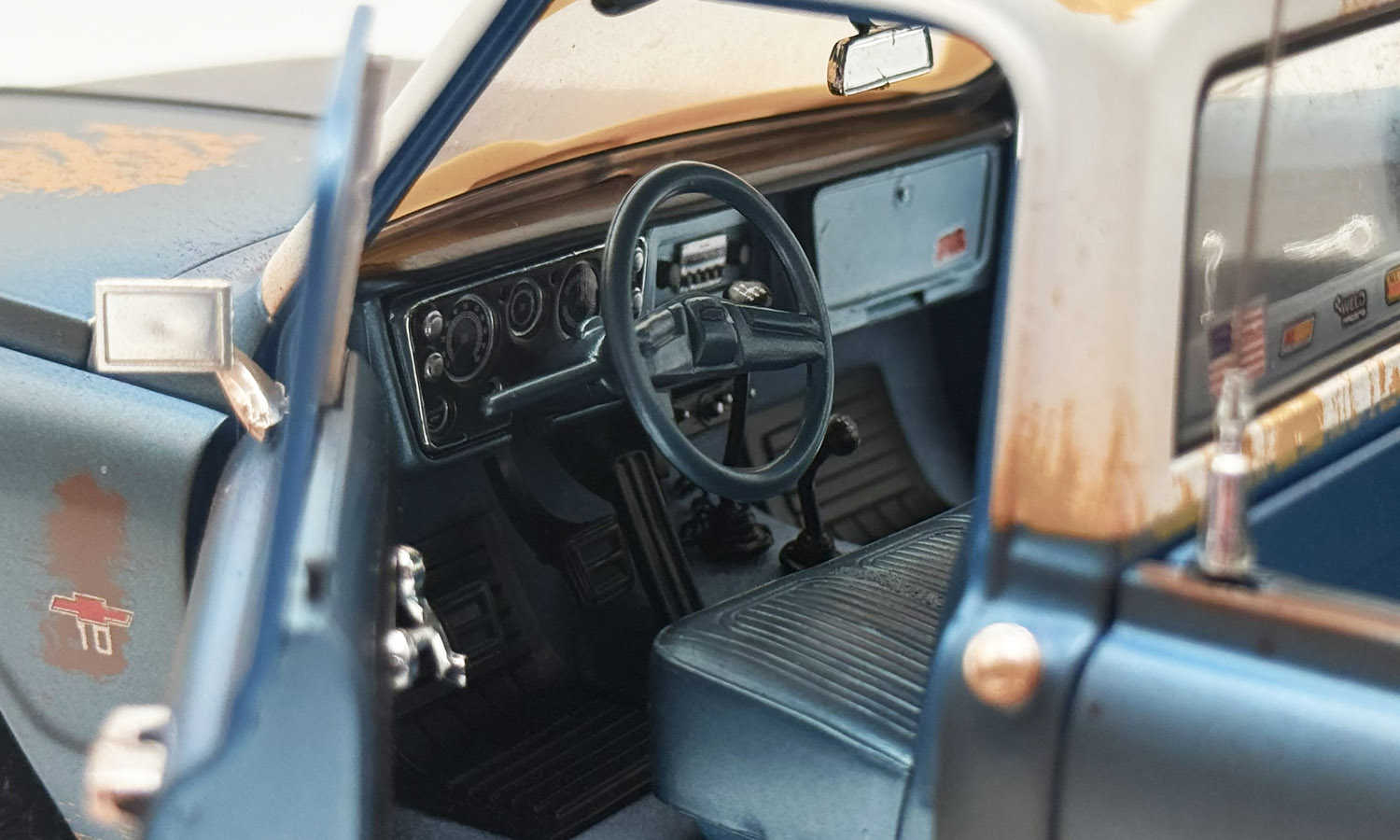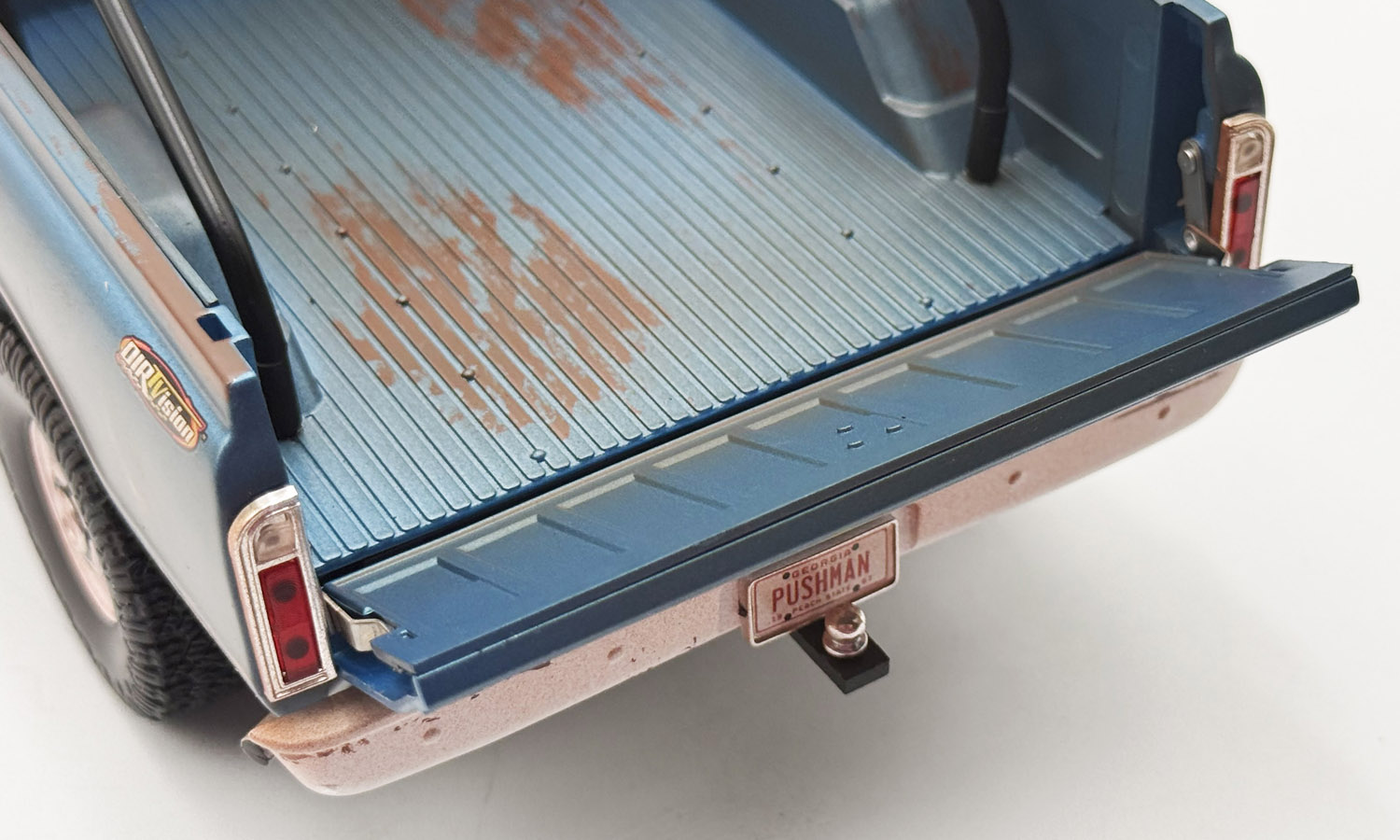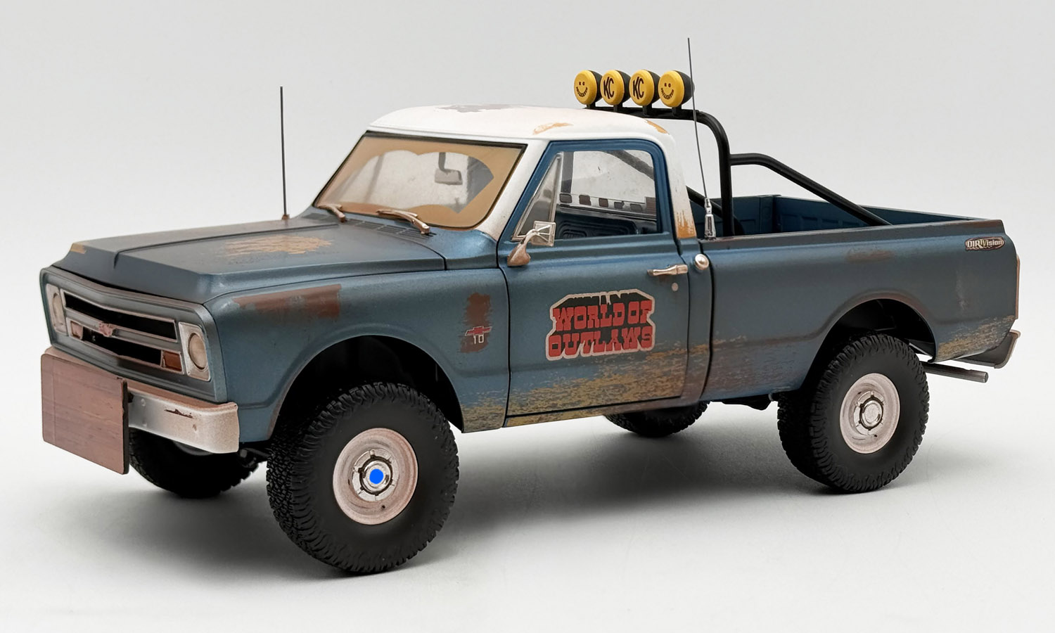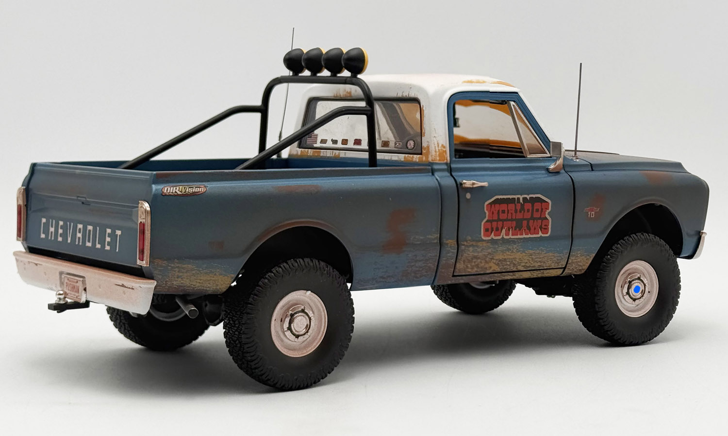 The World of Outlaws 1967 Chevrolet K-10 Push Truck is a must have for your sprint car collection! The model has all the features you'd expect in a dirt track push truck! It starts with the custom weathered/ dirty exterior and large off-road 35" wheels and tires powered by a Small Block 350 engine. We then move to the roll bar with KC lights, CB antenna, lifted suspension, and the wood push block on the front bumper. Now you're ready to get your diecast sprint car rolling for the A Main!!!