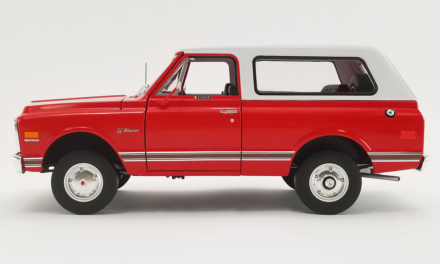 The Blazer was designed and marketed to compete with the Scout, Bronco and Jeep. The main goal of the Blazer was to simply offer a shortened pickup truck, which increased interior space and lowered costs of production being a shared platform. The Blazer offered off-road capabilities with features like air conditioning and automatic transmissions the competion could not. By 1970, the Blazer was outselling Ford, Dodge and Jeep in the markets. ACME is proud to announce this all new 1969-1972 Blazer tooling! Our first release in this iconic mold will be in beautiful Orange CST trim. This is the first time these Blazers have ever been made in 1:18 scale. These replicas are feature packed with opening doors hood and tailgate. Remove the top and check out the full interior detailing and then pop the hood and take a look at the fuly plumbed and wired engine! The chassis is also fully detailed with a full transfer case and dana axles!