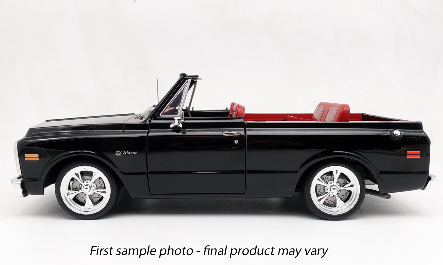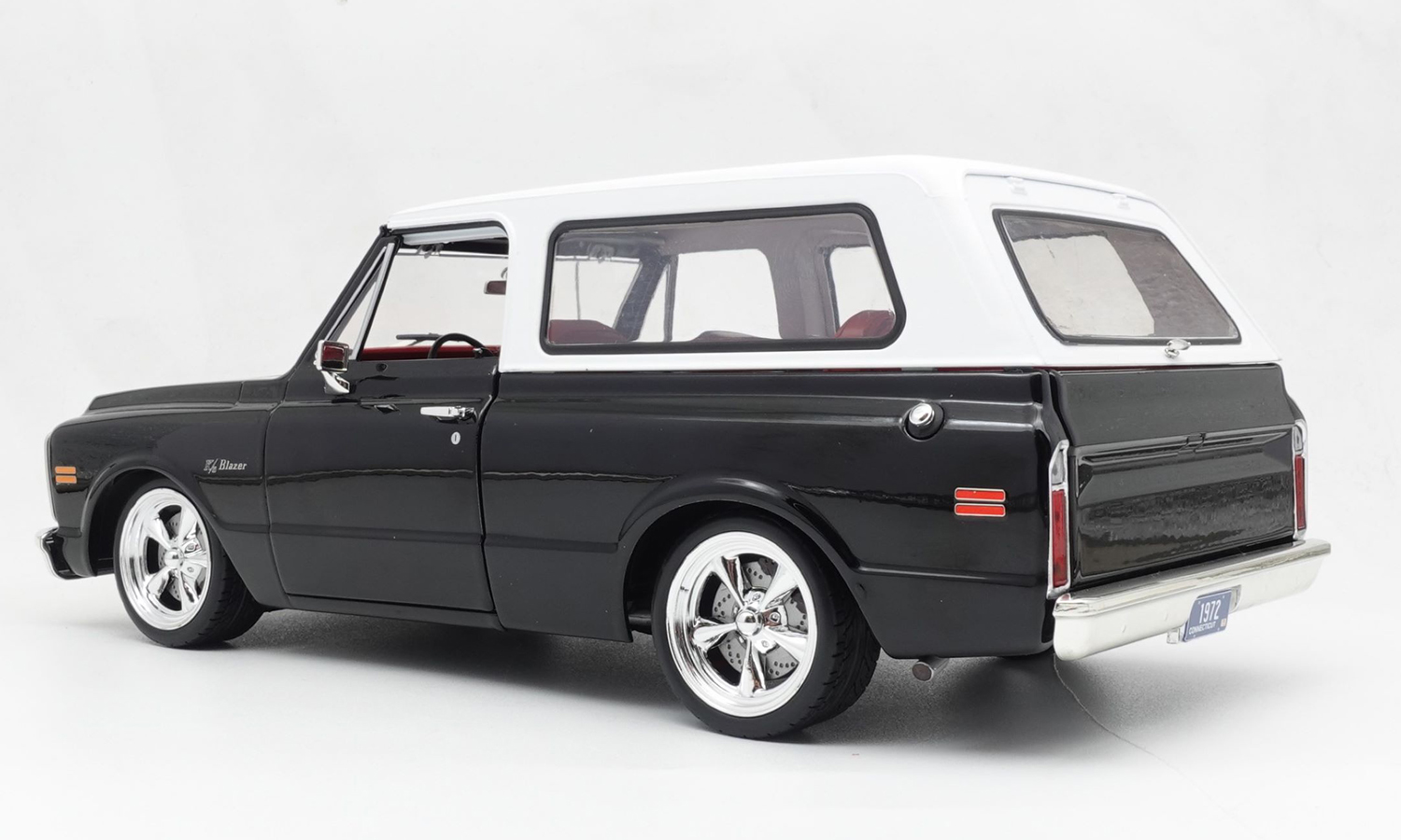 This 1972 Chevrolet Blazer Custom commands immediate attention with its lowered suspension, custom chrome wheels, and gorgeous gloss black paint with red interior. Lift off the removable white top to discover all the intricate details put into the passenger compartment. Fully detailed dashboard, tilting front seats, cloth seat belts, and fully carpeted interior!