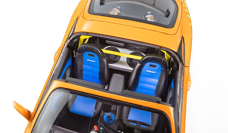 finished in vibrant orange pearl was applied by Japan's "Art Factory. Aluminum wheels by Silver Racing Hart M5 Tuners feature a clean five-spoke design that is simple yet unmistakably bold. Behind them are high-capacity brakes, essential for handling the car's increased power.