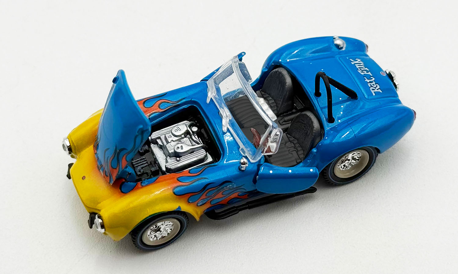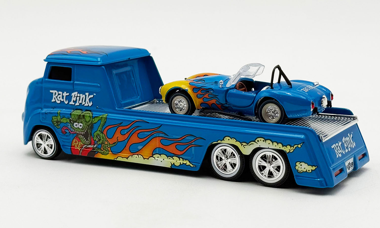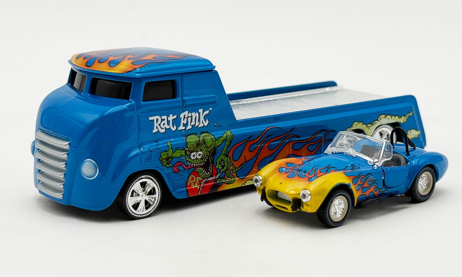Check out this awesome set! This 1:64 Rat Fink Hauler is finished in a slick blue paint job with flames and smoke trails and features the iconic Rat Fink figure! The Cobra Super Snake is finished in a matching paint scheme with the famous Rat Fink script on the trunk lid.